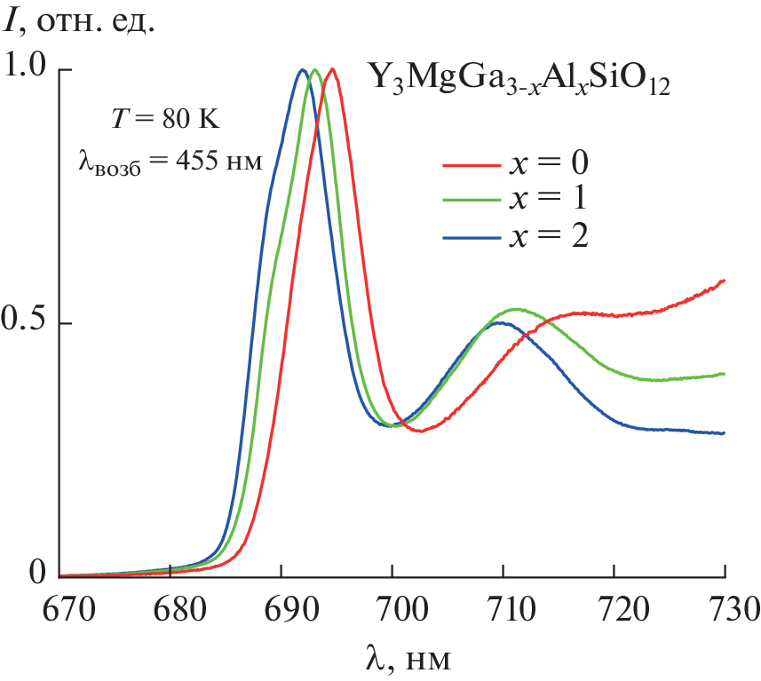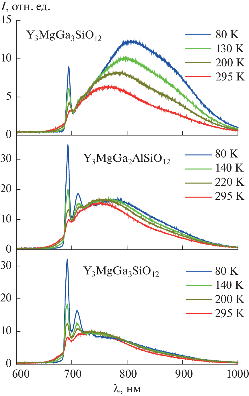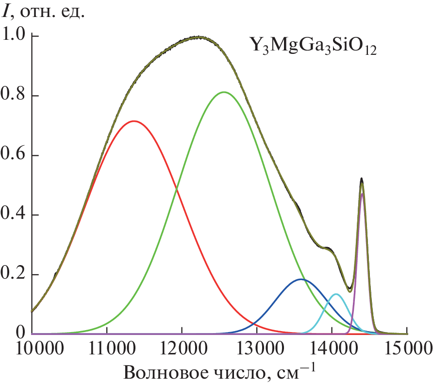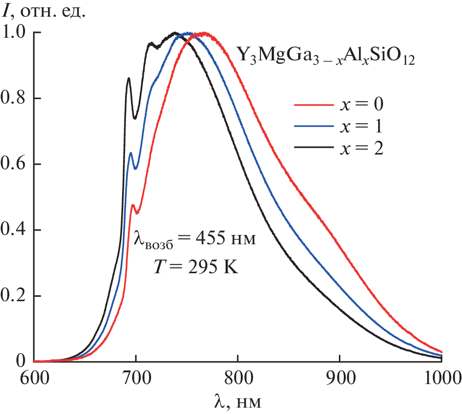 Ceramic samples of Y3MgGa3SiO12, Y3MgGa2AlSiO12, and Y3MgGaAl2SiO12 multicomponent garnets doped with 0.2 at % Cr3+ have been obtained by high-temperature solid-state synthesis. In the luminescence spectra of the synthesized garnet samples, overlapping broadband luminescence is observed in the far red spectral region caused by the 4T2 → 4A2 transition in Cr3+ ions, and a narrow band is observed in the range of 690–700 nm, corresponding to the zero-phonon line of the 2Е → 4A2 transition in Cr3+. The narrow-band and broad-band parts of the spectra are attributed to radiation from two different types of chromium centers, which are in octahedral coordination with different distortion degrees and strength of the crystal field. This results from the presence of two ions at the octahedral position of these garnets, which differ significantly in crystal chemical properties, namely, Mg2+ and Ga3+ (Al3+). The studied phosphors, which have broadband luminescence in the phytoactive far red region of the spectrum, have the potential for use in greenhouse LED lamps.