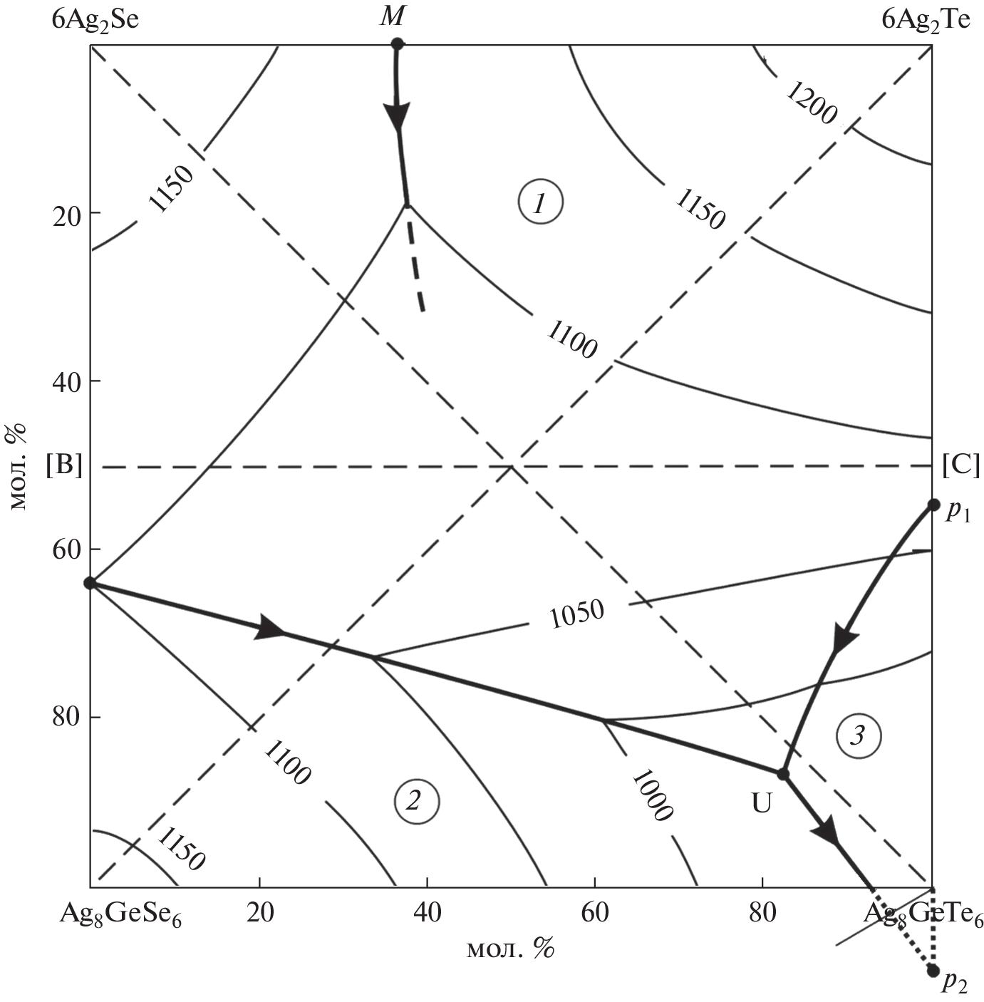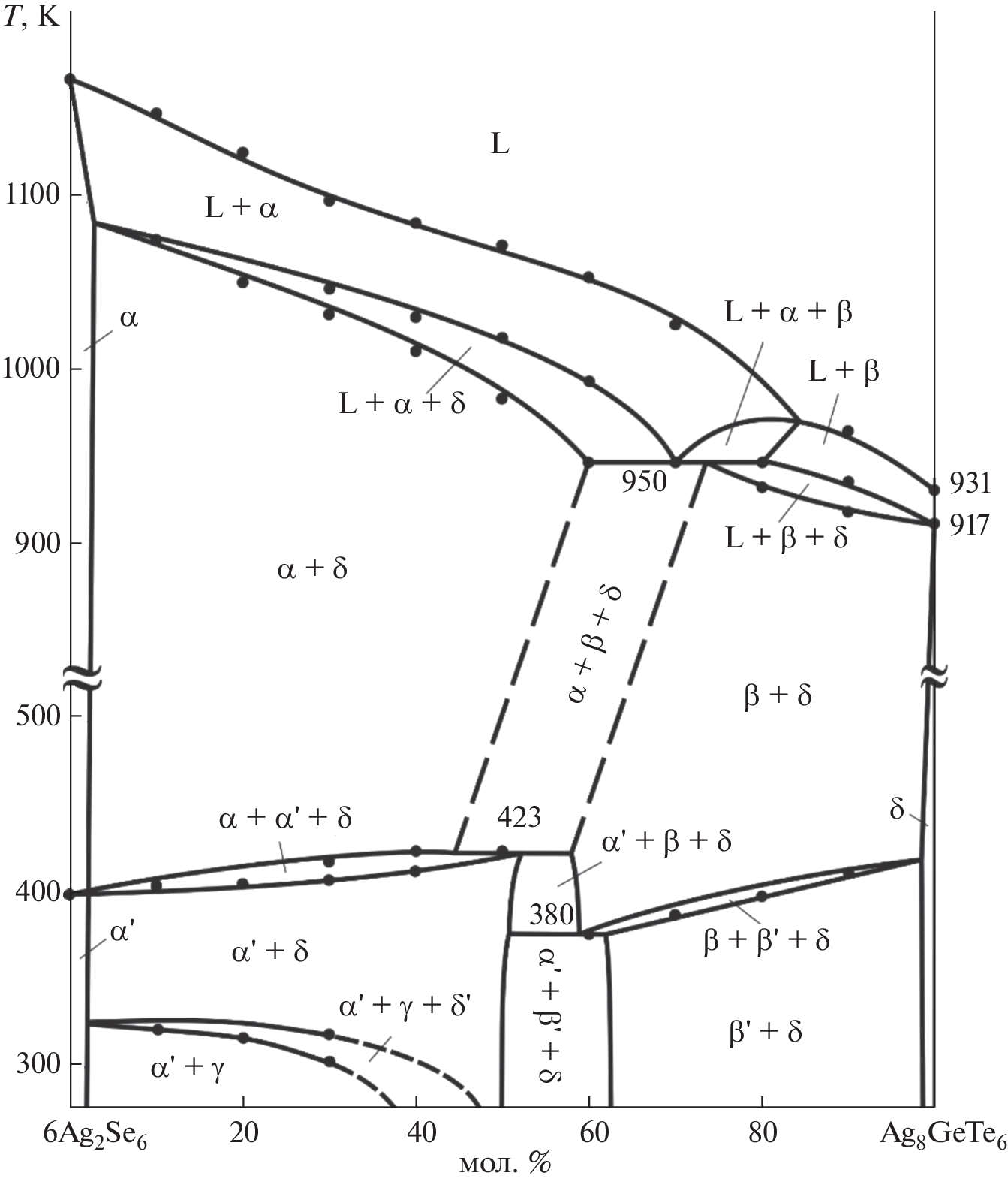 Here, we present the results of DTA and XRD studies of phase equilibria in the 6Ag2Se + Ag8GeTe6 ↔ 6Ag2Te + Ag8GeSe6 reciprocal system (system A). A Т–х diagram of the Ag8GeSe6–Ag8GeTe6 boundary system, several inner polythermal sections, isothermal sections at 300 and 1000 K, and the liquidus surface projection were plotted. The Ag8GeSe6–Ag8GeTe6 system is a partially quasi-binary system; it features continuous substitutional solid solutions between Ag8GeTe6 and the high-temperature cubic Ag8GeSe6 phase (the δ phase). Once solid solutions are formed, the polymorphic transition temperature in Ag8GeSe6 decreases, thereby stabilizing the ion-conducting cubic phase in the range of ≥40 mol % Ag8GeTe6 compositions at room temperature and below it. System A is shown to be a reversible reciprocal system; its liquidus surface is comprised of three fields, which relate to the primary crystallization of the solid solutions between the high-temperature Ag2Se and Ag2Te (α phase) phases, IT-Ag2Te-base solid solutions (β phase), and the δ phase. The subsolidus portion of system A features complex interactions related to polymorphism in the terminal compounds and in phases based on them