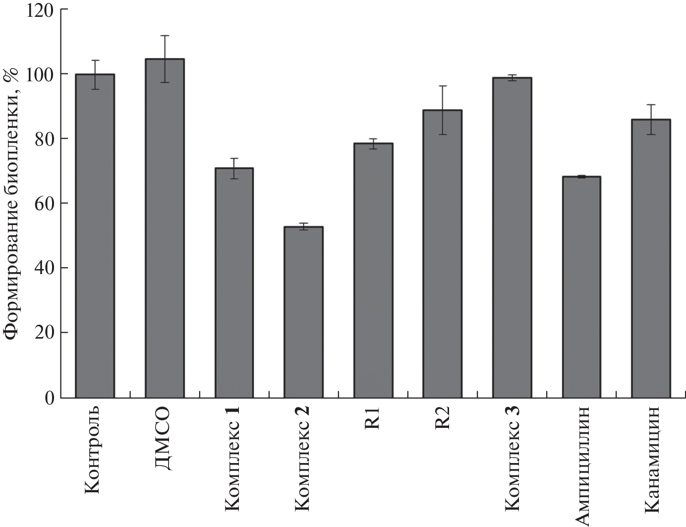 (NO)4] with R'= 2,4-dichlorothiophenyl (complex 3) were studied for the first time. The “amount of NO–biological activity” correlations were analyzed depending on the nature and position of the substituent in the thiophenyl ligand. Complex 2 was found to have antibacterial activity that was four times as high as that of the known antibiotic kanamycin. The anti-biofilm activity of complex 2 was studied; it inhibited 46% of biofilm formation and destroyed 32% of M. Luteus biofilms, surpassing the effects of the reference drugs kanamycin and ampicillin.