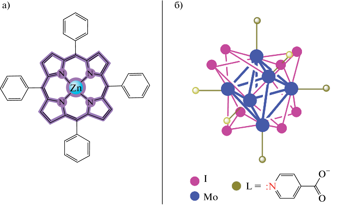 The possibility of the formation of supramolecular hybrids based on two photosensitizers, an octahedral molybdenum(II) iodide cluster with six terminal isonicotinate ligands (Bu4N)2[{Mo6I8}(OOC–C5H4N)6] (PyMoC, C) and A4-type zinc(II) porphyrin (ZnTPP, P), has been demonstrated. Spectrophotometric and NMR titration methods have shown that the formation of CPn complexes (n = 1–6) occurs in solutions of noncoordinating chlorinated solvents due to the formation of metal–N-ligand coordination bonds between the components. The use of an octahedral cluster as a hexatopic N-ligand and the lability of the Zn···NPy bonds together lead to the formation of a series of CPn complexes (n = 1–6), which are in dynamic equilibrium in solution. Nevertheless, conditions have been selected to isolate single crystals of individual forms CP4 + 2 and CP6 + 2, and their structures have been determined by X-ray diffraction analysis. The PyMoC cluster turns out to coordinate four or six ZnTPP molecules, respectively, while both structures contain two “extramolecules” of zinc(II) porphyrin bound to the cluster via hydrogen bonds involving the oxygen atoms of the isonicotinate groups and protons of water axially coordinated to the porphyrin metal center.
