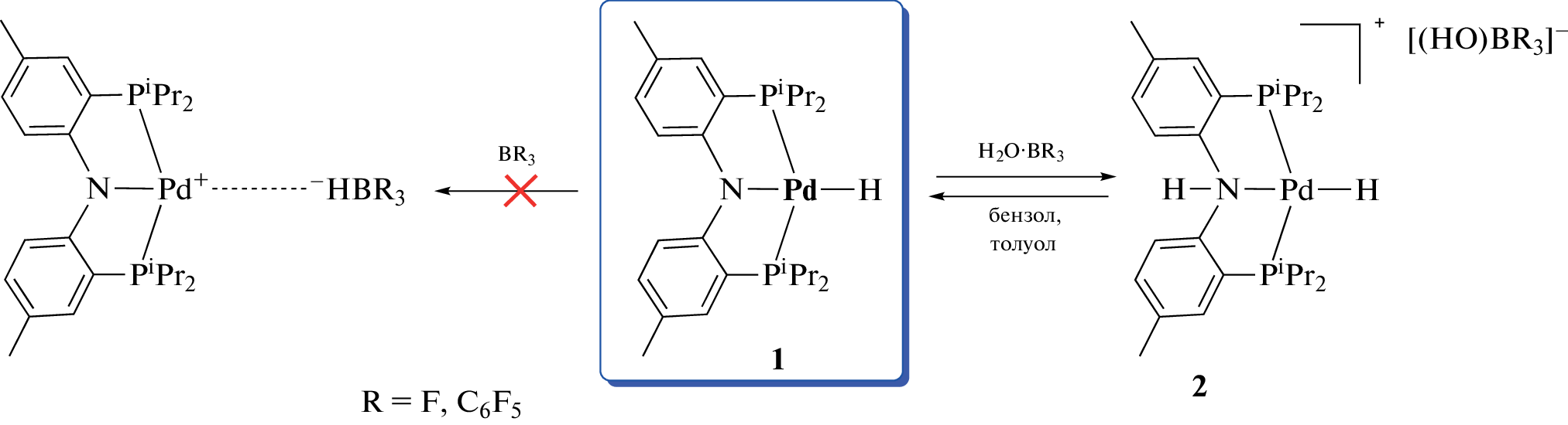 It was found that the reaction of 1 with boron-containing Lewis acids unexpectedly leads to the protonation of the nitrogen atom of the pincer ligand with an impurity of water, rather than the reaction with the hydride ligand. According to DFT calculations, the proton affinity of the nitrogen atom is much higher than that of PdH, which determines its higher activity in protonation processes.