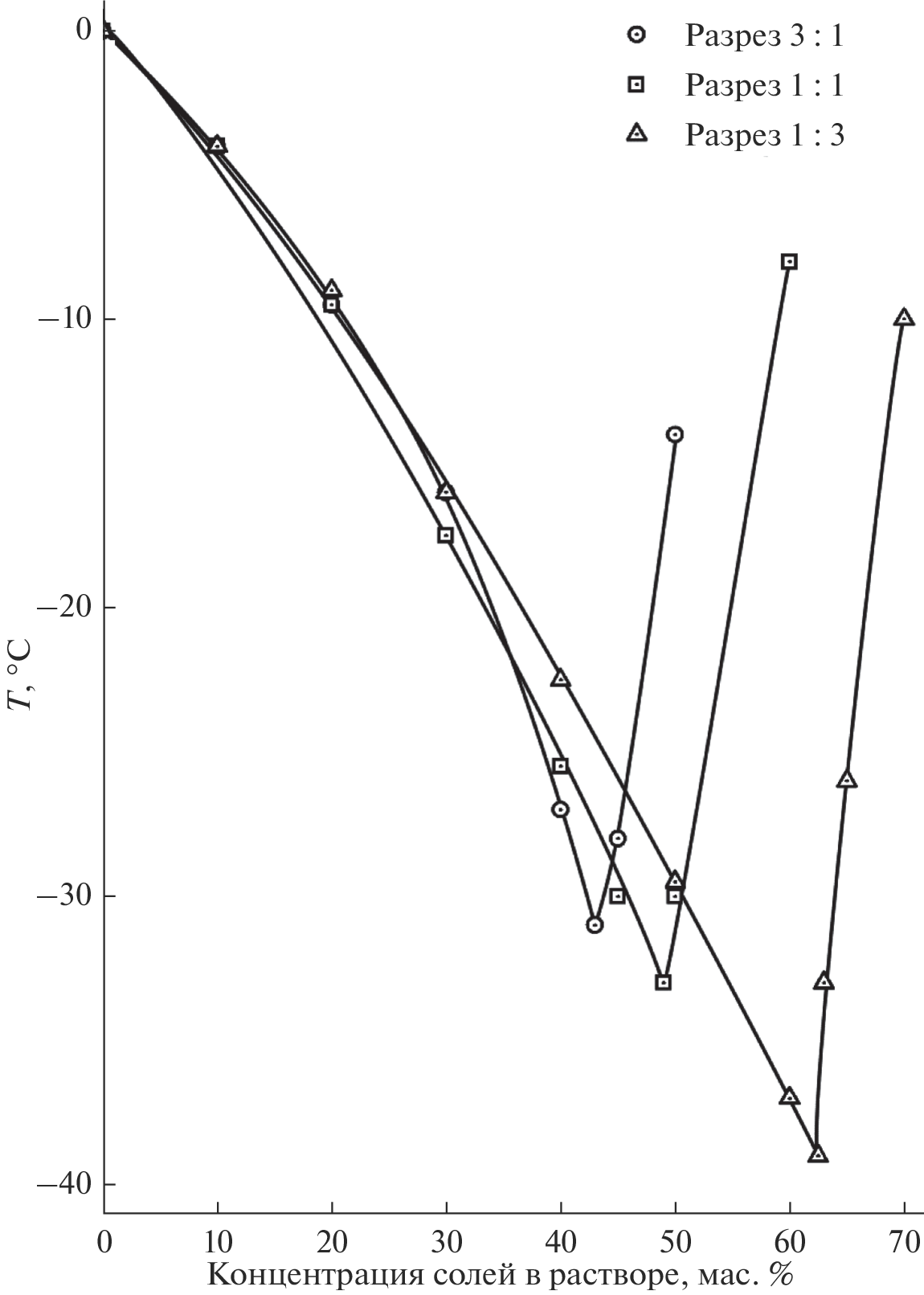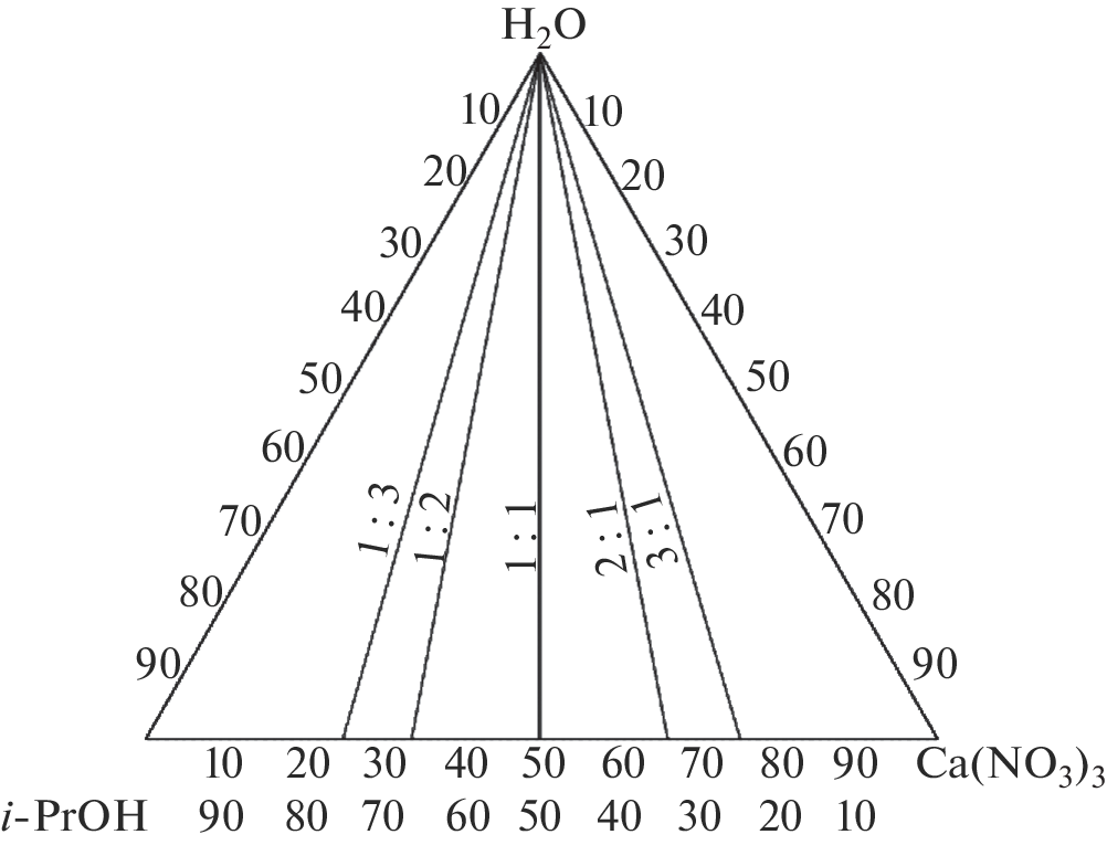 Phase equilibria in sections of the Ca(NO3) system are investigated2–i-PrOH–H2O at temperatures below 0 °C and anti-icing properties of calcium nitrate and isopropanol compositions with a component ratio from 1 : 3 to 3: 1, temperatures, composition of eutectic with ice and melting ability of nitrate-isopropanol compositions at temperatures of -5 and -10 °C. Compositions characterized by good anti-icing properties have been identified.