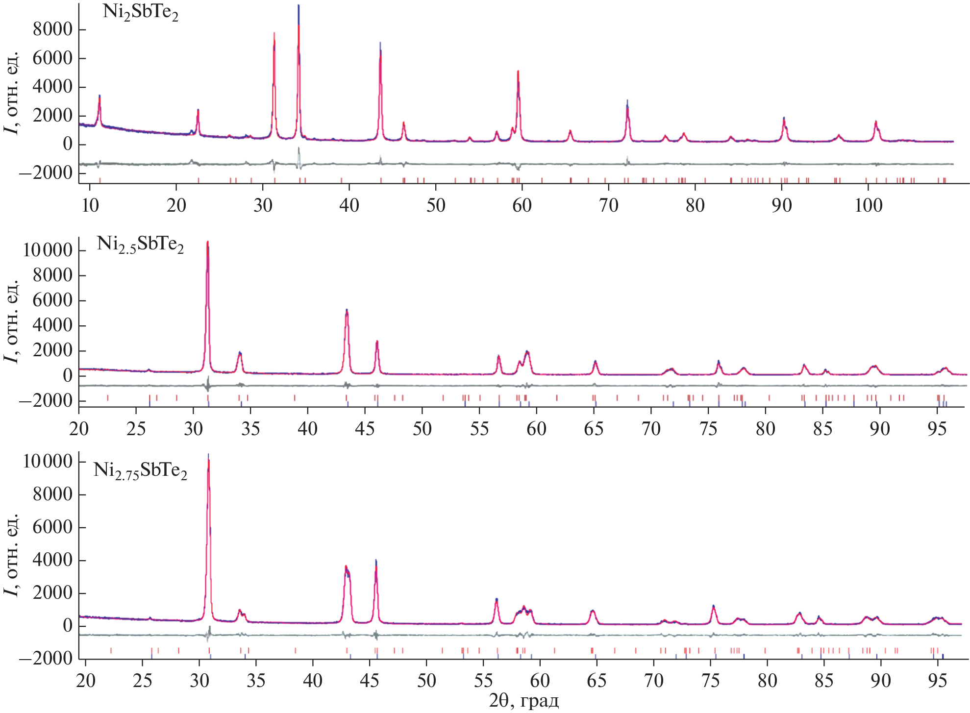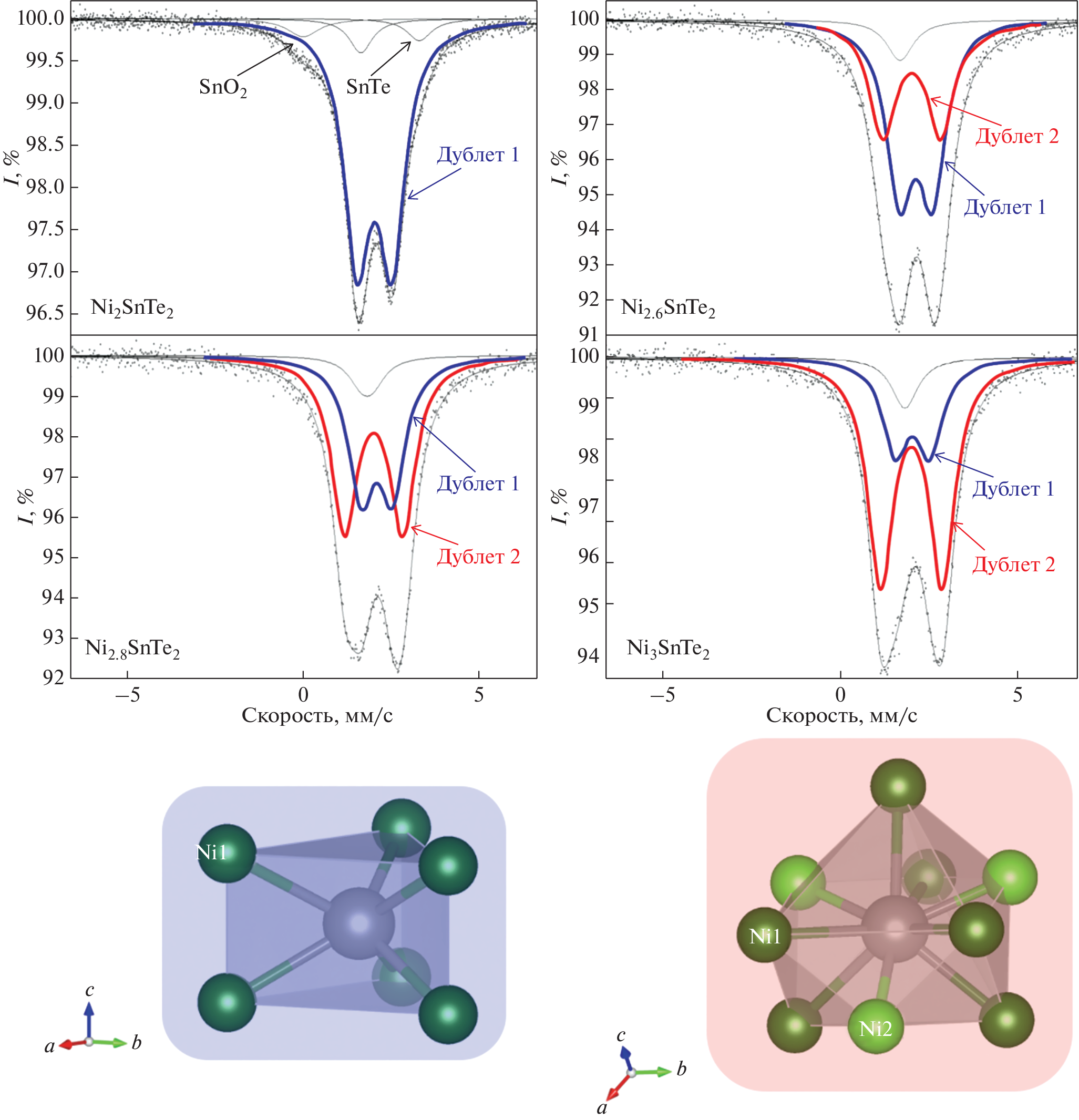 Series of compounds Ni3 – xMTe2 (M = Sb, Sn; x = 0–1) were obtained by high-temperature sealed-tube synthesis and characterized by X-ray powder diffraction and 121Sb and 119Sn Mössbauer spectroscopy. For Ni3–xSnTe2, it was shown that, as х varies from 1 to 0, nickel is distributed over three possible sites, two of which give a total occupancy of 1 and have ordered vacancies. Meanwhile, for Ni3–xSbTe2 and х other than ~0.9–1.0, the vacancy ordering disappears. The temperature dependence of the presence or absence of vacancy ordering was established for Ni2SbTe2; the ordering disappears on heating above 600°C and appears again on cooling.