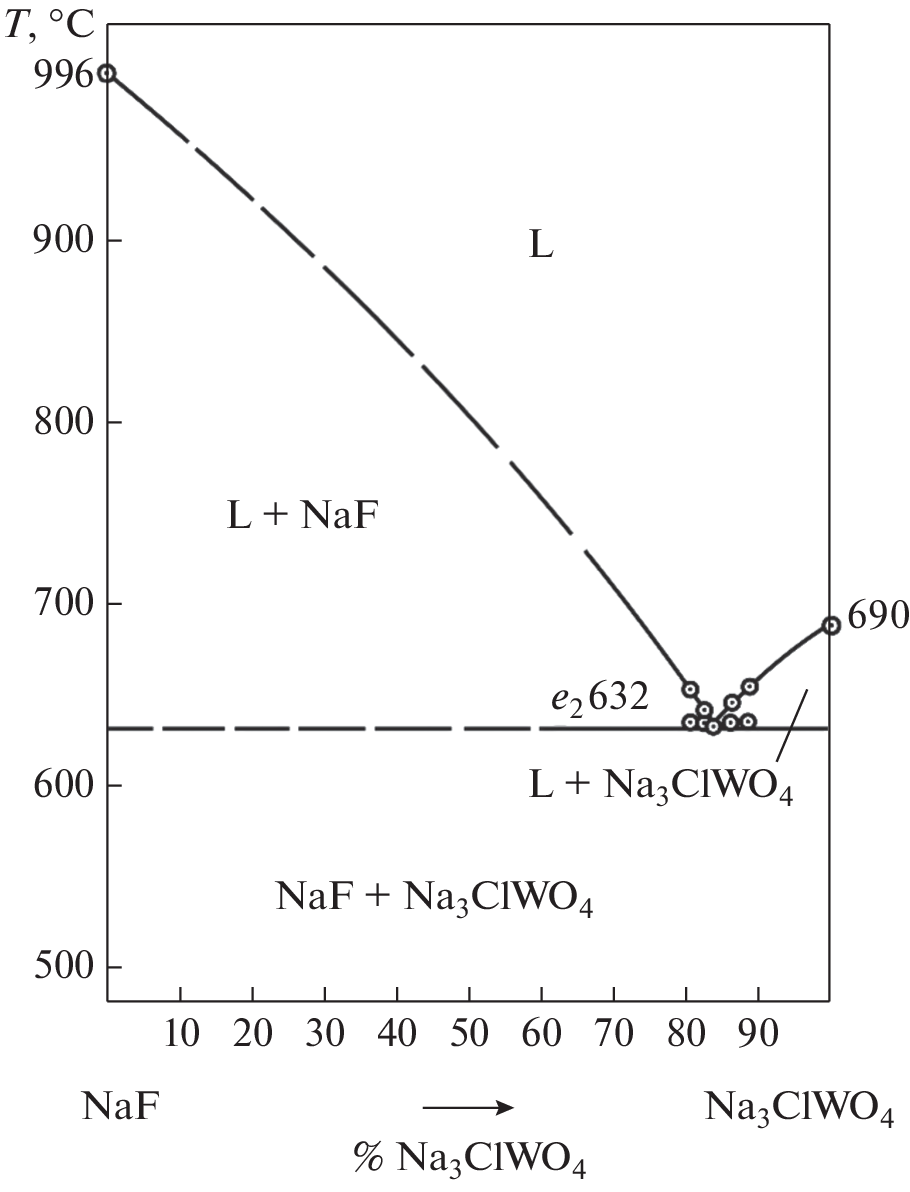 Theoretical and experimental studies of the NaF–Na3ClMoO4–Na3ClWO4 stable secant triangle of the NaF–NaCl–Na2MoO4–Na2WO4 four-component system have been carried out. The review of the literature concerned with the boundary elements of the title system has shown two options for the numbers and compositions of crystallizing phase: in case the solid solutions are stable, two solid phases would be formed, and in case of their decay, three solid phases would. The experimental tools used to study the NaF–Na3ClMoO4–Na3ClWO4 system were differential thermal analysis (DTA) and X-ray powder diffraction (XRD). The melting point and composition of the mixture that correspond to point d, which lies on monovariant curve e1e2 connecting binary eutectics, have been determined. X-ray powder diffraction showed two solid phases, namely, NaF and Na3ClMoxW1 – xO4 continuous solid solutions (CSS), in an alloy of point d composition. The nonexistence of invariant points in the title system has been shown. The CSS based on Na3ClMoO4 and Na3ClWO4 are stable. The projection of the phase assemblage of the system on the composition triangle is represented by two crystallization fields of the terminal components: a sodium fluoride field, which is the dominant one, and a Na3ClMoxW1 – xO4 CSS field.