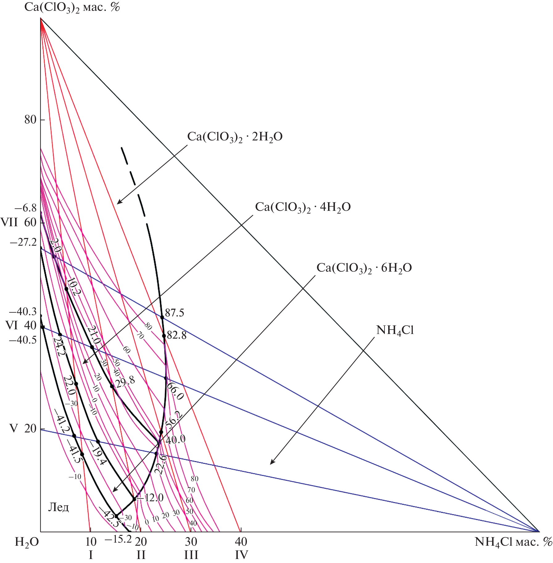 The Сa(ClO3)2∙NH4Сl–H2O system has been studied in its constituent binary systems and seven inner sections, and its polythermal solubility diagram has been plotted in the range of temperatures from–42.5 to 87.5°С. The solubility diagram features the crystallization fields of ice; calcium chlorate hexahydrate, tetrahydrate, and dihydrate; and ammonium chloride. Three ternary points exist in the system. The system belongs to the complex eutonic type; its components retain their individuality and show good solubility in water. In the [40% Сa(ClO3)2 + 60% H2O]–[NH4Сl] section of the studied system, variations in crystallization temperature, viscosity, density, pH, and refractive indices of the solution have been determined. The thus-obtained results have been used to plot the composition–property diagram of the [40% Сa(ClO3)2 + 60% H2O]–[NH4Сl] section of the Сa(ClO3)2∙NH4Сl–H2O system.