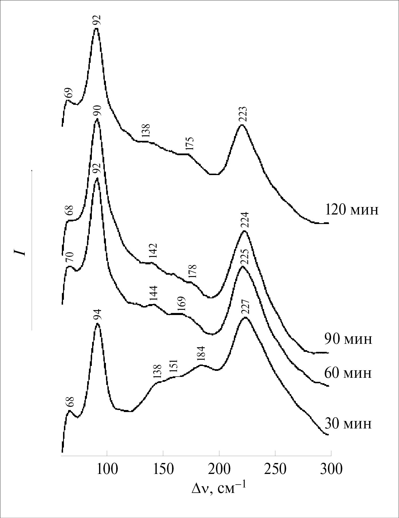 На рис. 3 представлены КР-спектры пленок SnS. Линии при ~70 (B1g), ~90 (Ag), ~170 (B3g), ~190 (Ag) и ~220 (Ag) см–1 характерны для á-SnS. Линии при ~90, ~170 и ~220 см–1 соответствуют поперечной оптической (ТО) моде. Пики при ~70 и ~190 см–1 относятся к продольным оптическим (LO) модам [29]. При коротком времени (30 мин) формирования пленки в КР-спектре обнаруживается малый по интенсивности пик при 151 см–1. С увеличением времени процесса данная линия исчезает с образованием слабых пиков в диапазоне 170–180 см–1 (B3g). Линия при ~ 140 см–1 может быть отнесена к моде B2u, которая активна в ИК-спектре. Появление в спектрах КР дополнительных линий является следствием нестехиометрии или искажения структуры в результате разупорядочения атомов. Происходит снятие вырождения колебаний, расщепление линий на компоненты и появление неактивных мод.