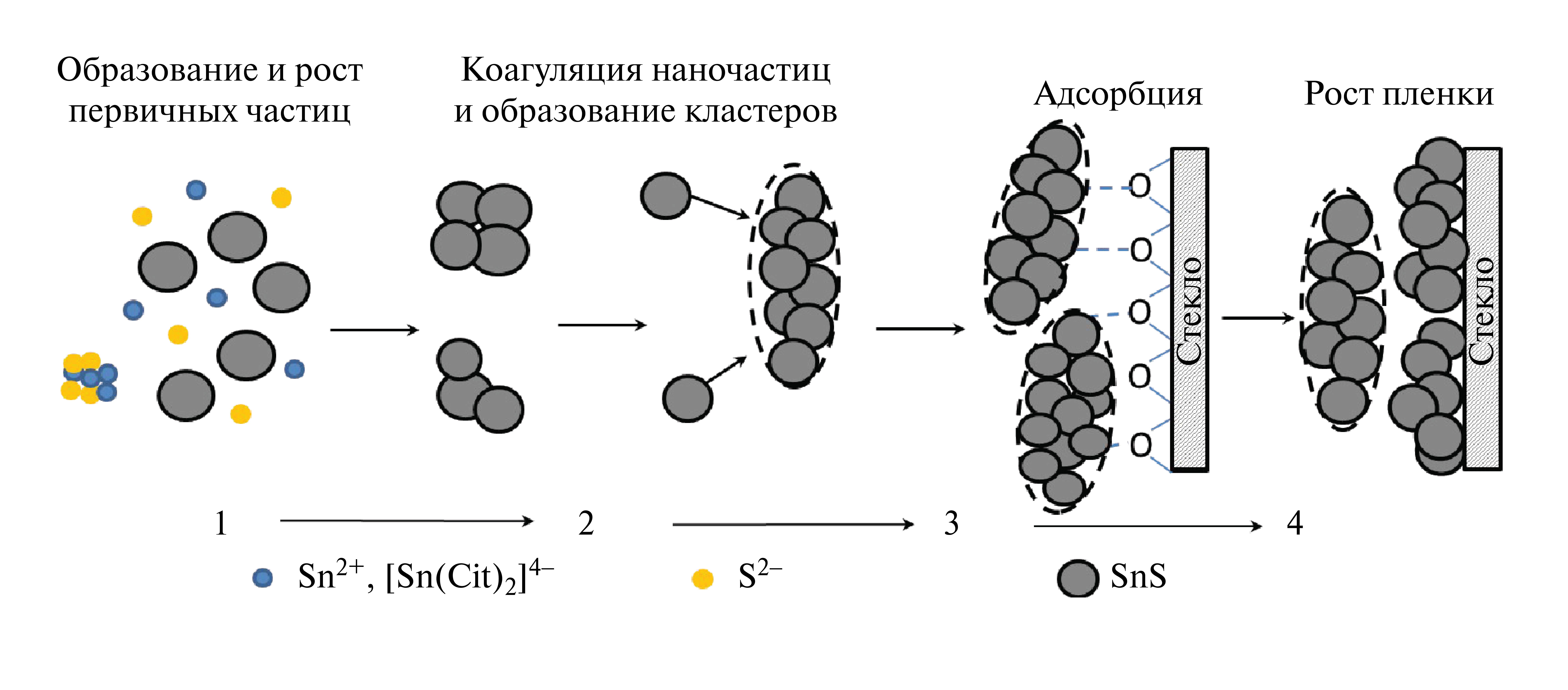 Для получения тонкопленочного полупроводника SnS разработан целый ряд методов, среди которых термическое вакуумное испарение [10, 11], магнетронное распыление в плазмообразующей среде аргона [12], физическое осаждение из газовой фазы [13], атомно-слоевое осаждение (молекулярное наслаивание) [14], сульфидизация пленок металлического олова [15], спрей-пиролиз [16], электрохимическое осаждение [17] и химическое осаждение из растворов [18]. Среди упомянутых особый интерес представляет метод химического осаждения из растворов, который отличается высокой производительностью, простотой и минимальным энергопотреблением, наряду с широкими возможностями варьирования состава и функциональных свойств [18–23]. В публикациях, посвященных химическому осаждению тонких пленок SnS, обсуждаются перспективы использования в качестве халькогенизатора тиоацетамида CH3CSNH2 [19], тиомочевины N2H4CS [20] и тиосульфата натрия Na2S2O3 [21, 22]. Однако сведений по механизму формирования тонкого слоя SnS на подложке при химическом осаждении в рамках принципов “зеленой химии”, т. е. с использованием экологически безопасного сульфидизатора Na2S2O3, ни в российской, ни в зарубежной литературе нами не найдено.