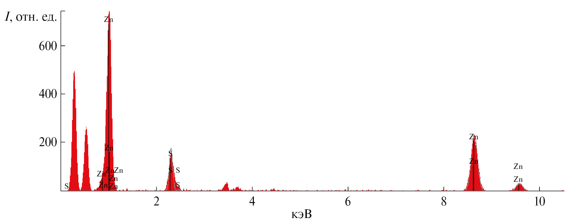 Результаты электронно-зондового микроанализа образцов ZnS и ZnS–Mn приведены на рис. 5–8. На электронных фотографиях (рис. 5, 7) выделены области (прямоугольники) и точки (крестики) измерений, размер которых составляет ~1 мкм. Типичные энергодисперсионные спектры образцов ZnS и ZnS–Mn приведены на рис. 6 и 8. Результаты электронно-зондового анализа подтверждают элементный состав продуктов синтеза, а также их распределение на поверхности частиц ZnS. Уширение сигналов в спектрах может быть связано со структурной неоднородностью вещества, что, в свою очередь, косвенно подтверждает ранее высказанное предположение о политипной структуре формирующихся кристаллов.
