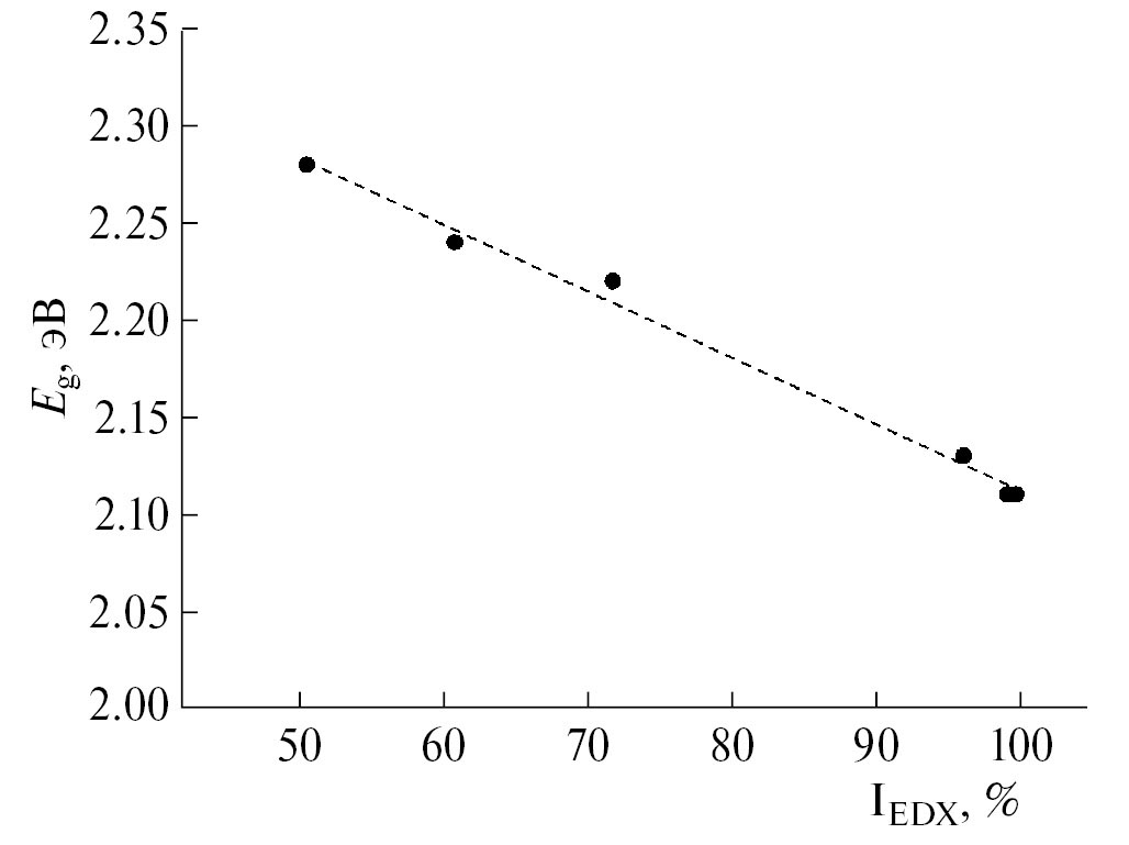Рис. 3. Зависимость значений оптической ширины запрещенной зоны (Eg) от доли иода в твердых растворах p3–p8 (IEDX). По оси у Еg, эВ.