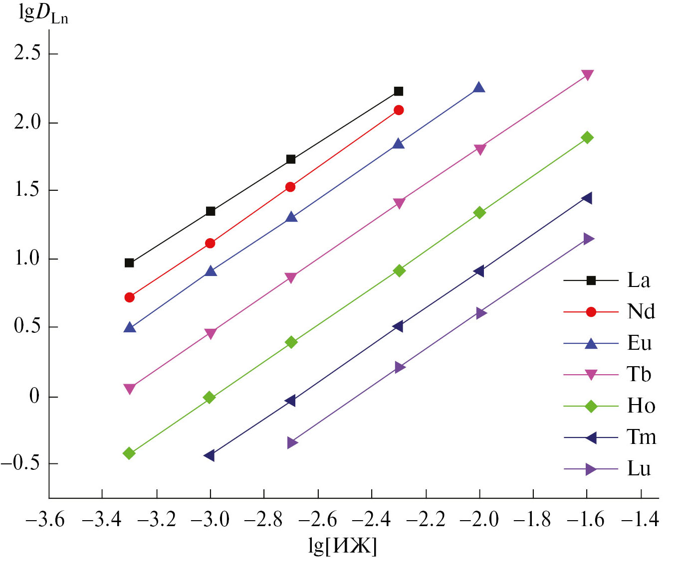 Из этих уравнений следует, что повышение концентрации [ImP][Tf2N]2 в органической фазе должно приводить к увеличению эффективности экстракции Ln(III), а повышение концентрации ImP2+ в водной фазе – к ее снижению. Это подтверждают экспериментальные данные: угловой наклон зависимости lgDLn–lg[ImP(Tf2N)2] близок к 1.5 (рис. 4), а угловой наклон зависимости lgDLn– lg[ImP2+]–к–1.5 (рис. 5). Данный факт свидетельствует о том, что ионы Ln(III) экстрагируются смесями лиганда L и [ImP][Tf2N]2 по механизму катионного обмена.