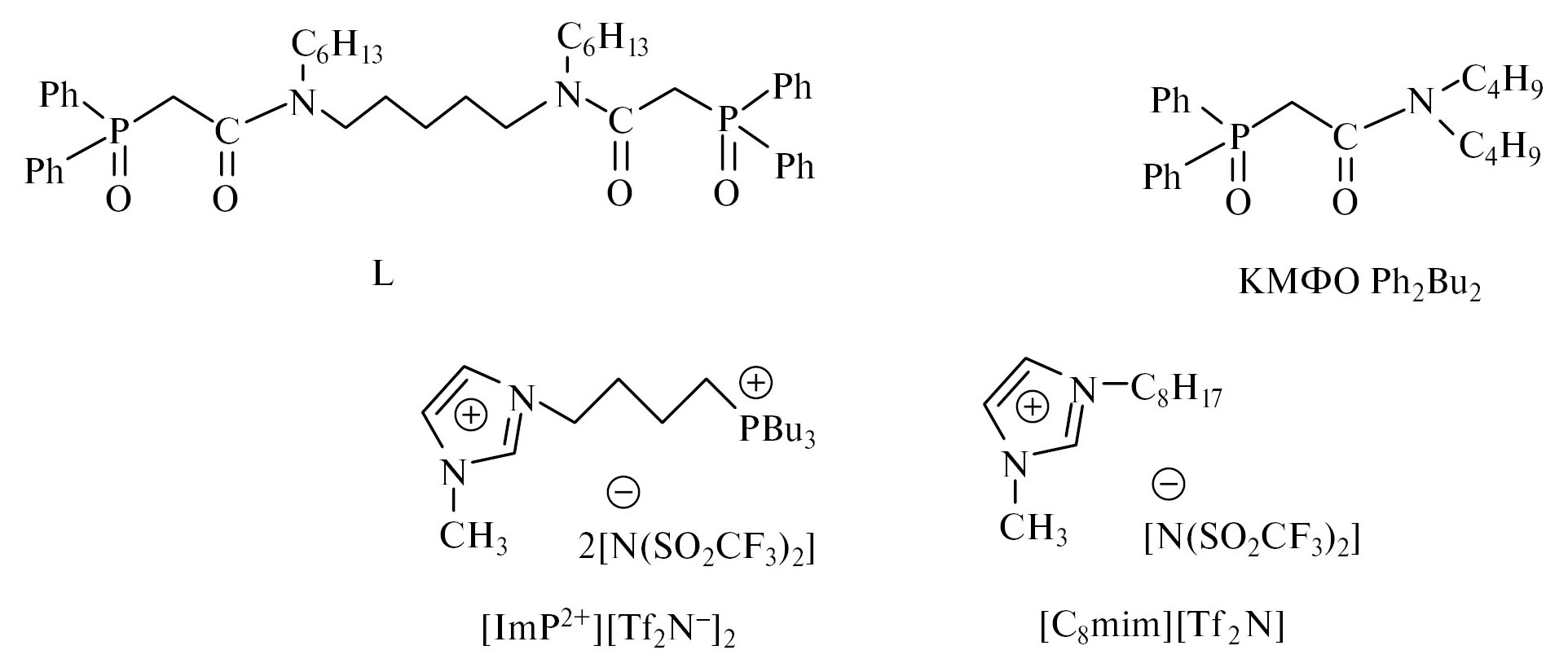 1,5-N,N′-бис[(дифенилфосфинил)ацетил(гексил)амино]пентан (L) [24], дифенил(дибутилкарбамоилметил)фосфиноксид (КМФО Ph2Bu2) [25] и ионную жидкость бис[(трифторметил)сульфонил]имид 1-октил-3-метилимидазолия ([C8mim][Tf2N]) [26] синтезировали и очищали по ранее описанным методикам.