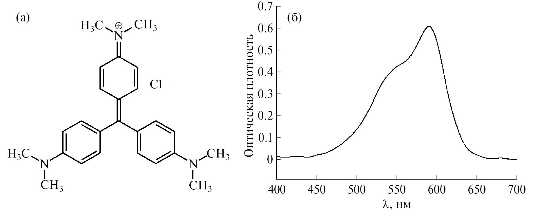 Для исследования фотокаталитической активности полученных в работе композитов нами был выбран краситель кристаллический фиолетовый (КФ) — основный трифенилметановый краситель с химической формулой C25H30N3Cl (рис. 1а). Кристаллический фиолетовый широко используется в бактериологии, аналитической химии, а также в производстве для окрашивания шерсти, шелка, хлопчатобумажных изделий, пшеничной соломы, бумаги, кожи, перьев, что может приводить к загрязнению используемым красителем сточных вод [34–36]. КФ имеет широкий максимум поглощения в интервале длин волн 470–640 нм (λmax = 590 нм), оптический спектр поглощения его водного раствора (С = 2.5 × 10–5 моль/л) приведен на рис. 1б.