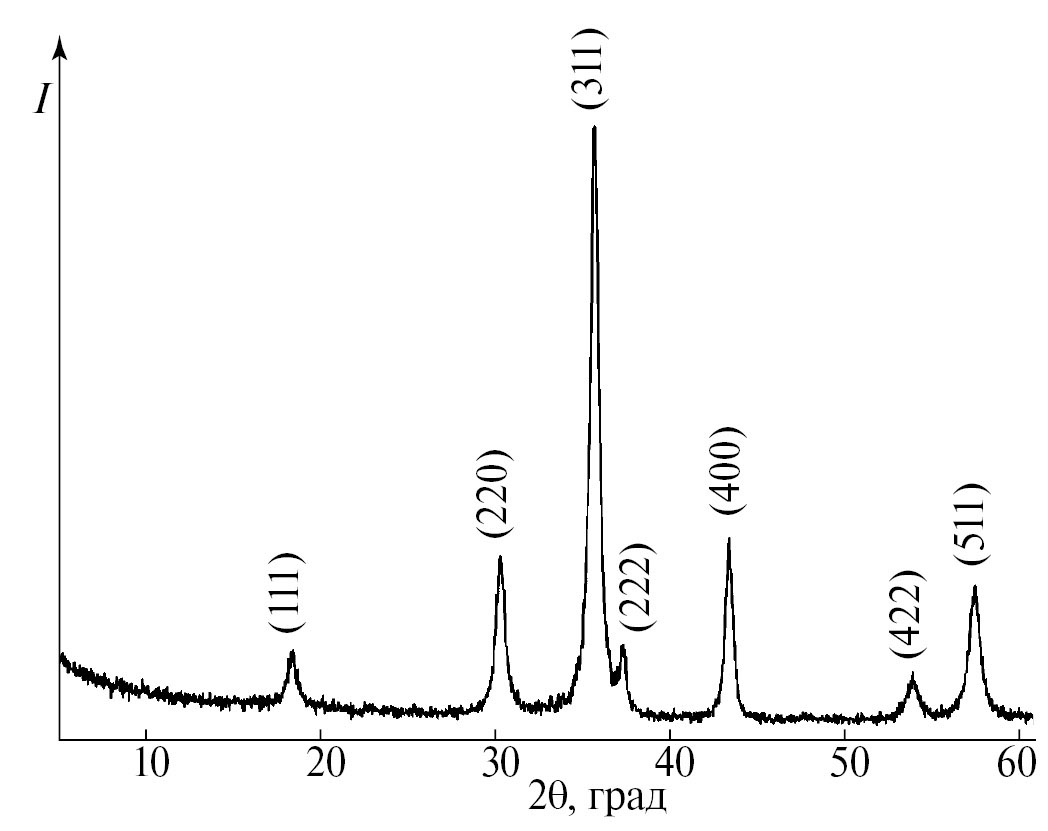По данным рентгенофазового анализа, образец 9, полученный в оптимальных условиях, представляет собой чистую фазу феррита никеля (рис. 4, все рентгеновские рефлексы характерны для NiFe2O4), размер кристаллита, рассчитанный по формуле Дебая–Шеррера, составляет 13.6 ± 0.4 нм. Следует отметить, что каждая частица феррита никеля состоит из одного кристаллита.