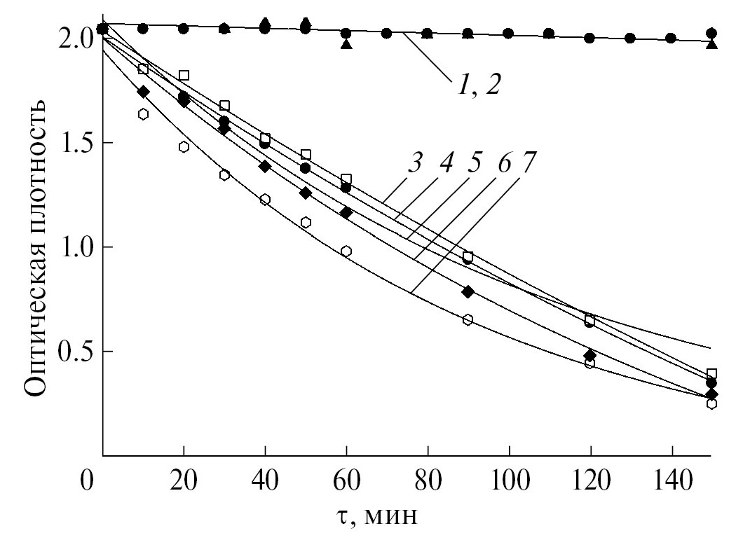 Рис. 8. Изменение оптической плотности раствора кристаллического фиолетового (λmax = 590 нм) в зависимости от длительности процесса фотокаталитического разложения: 1 – NiFe2O4, 2 – ZnFe2O4, 3 – образец К4, 4 – образец К3, 5 – образец К2, 6 – образец К5, 7 – образец К1.