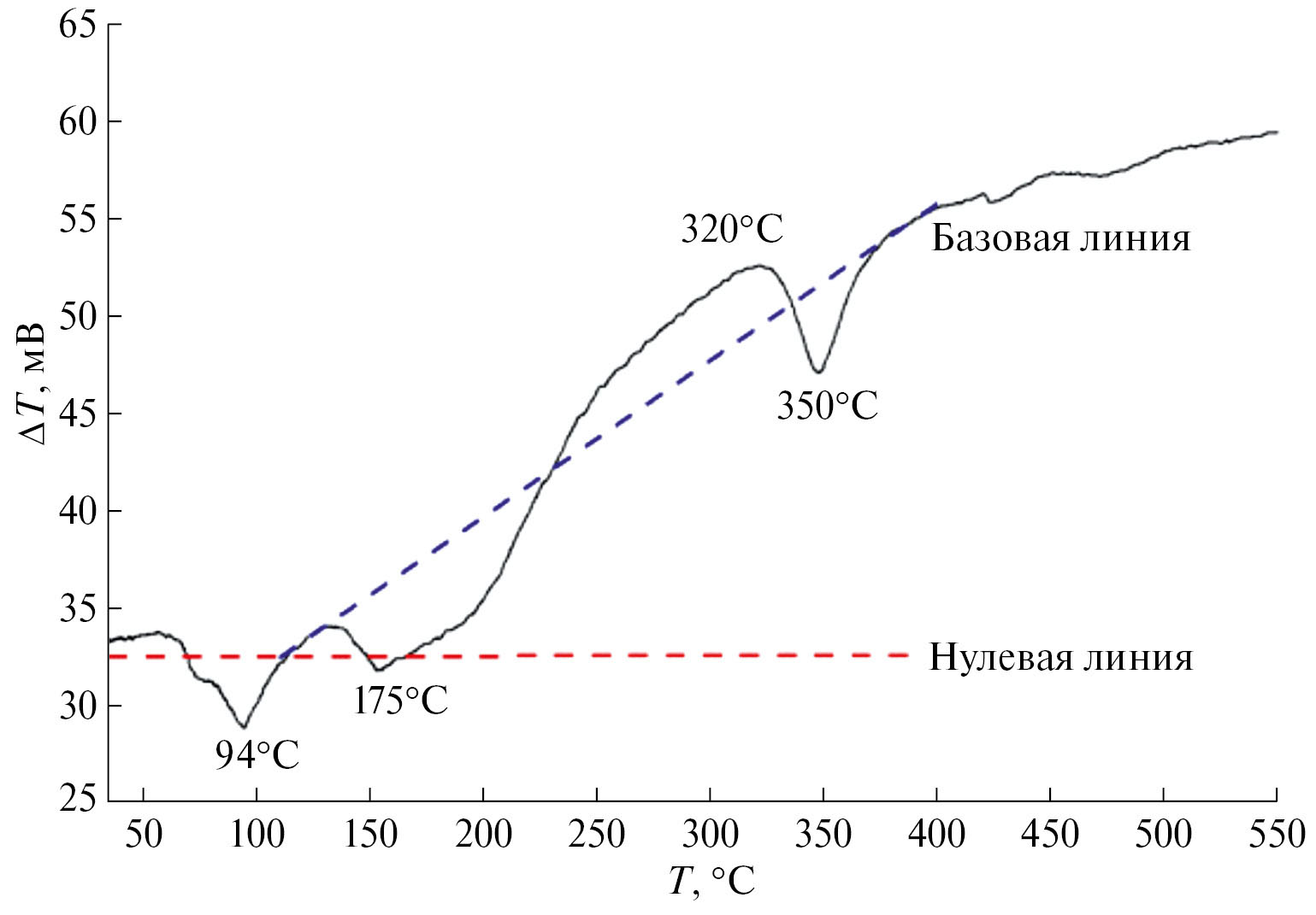Рис. 1. Результаты дифференциального термического анализа нанопорошка состава Gd0.4Sr0.1Co0.5O3, полученного методом совместной кристаллизации солей.