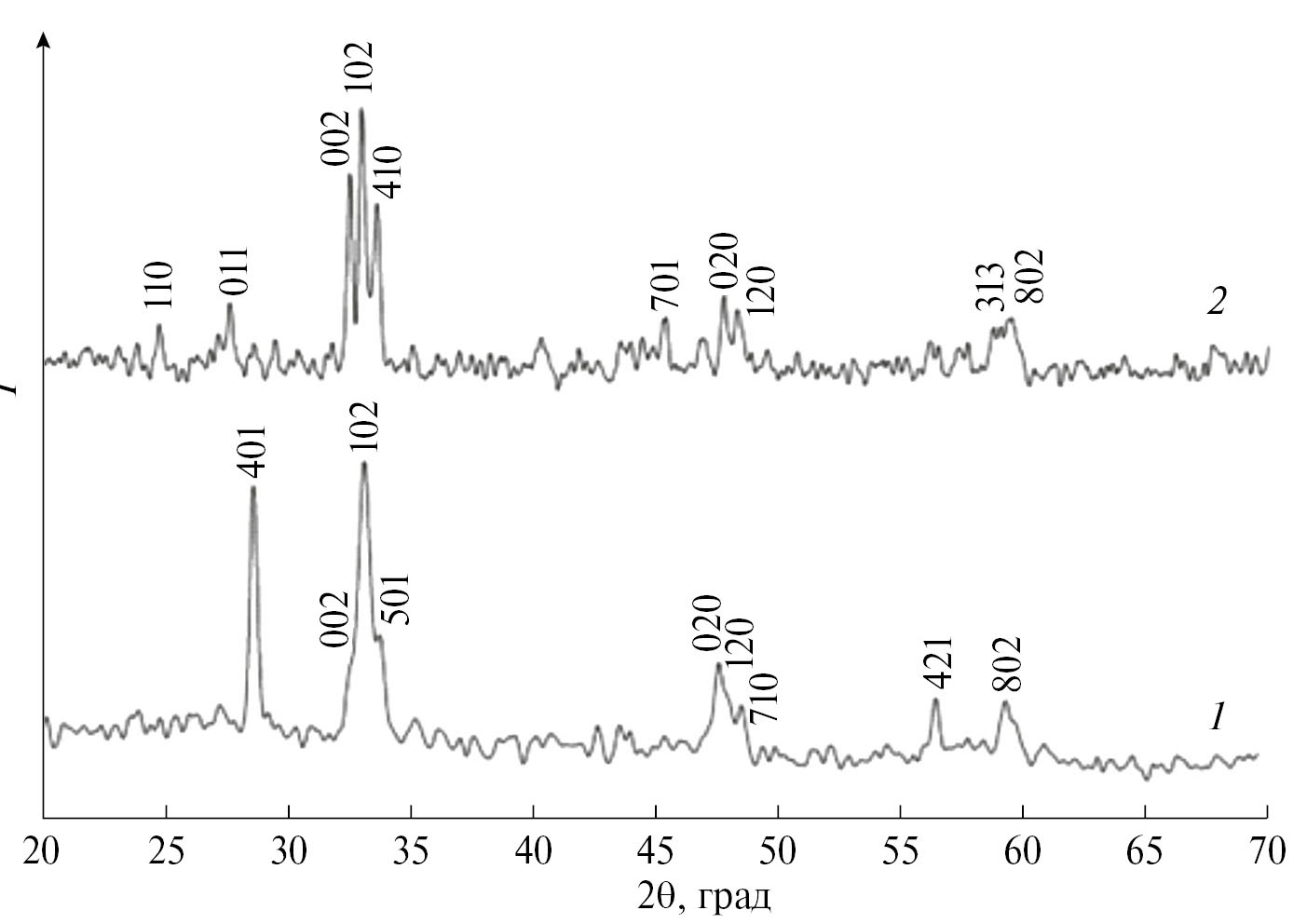 Рис. 2. Рентгенограммы нанопорошка (1, 600°С) и керамического образца (2, 1300°С) состава (СeO2)0.85(Nd2O3)0.15, синтезированного методом совместной кристаллизации солей церия и неодима.