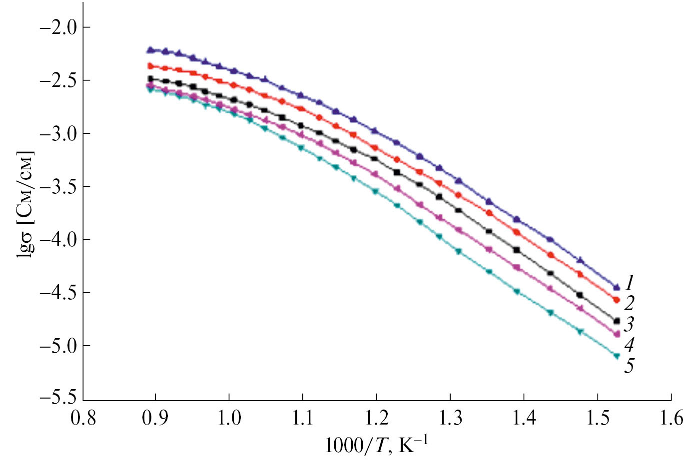 Рис. 5. Температурные зависимости удельной электропроводности керамических образцов со спекающей добавкой ZnO состава (СeO2)1–x(Nd2O3)x, где x = 0.15 (1); 0.10 (2); 0.20 (3); 0.05 (4); 0.25 (5).