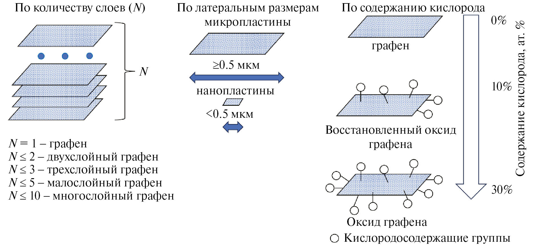 Несмотря на то, что первая работа по получению графеновых 2D-наноструктур опубликована еще в 1958 г. [1], т.е. задолго до открытия других аллотропных форм наноуглерода, исследователи еще долго не проявляли значительного интереса к данному классу материалов. Однако все изменилось после того, как пионерская работа А. Гейма и К. Новоселова, посвященная выделению графена механической эксфолиацией из графита, была отмечена Нобелевской премией. Это побудило множество научных групп к постановке работ по синтезу и изучению свойств графена, а также поиску областей его практического применения. В ходе проведенных в мире исследований было установлено, что графен обладает рекордными физическими характеристиками: его теплопроводность составляет ~5000 Вт/(м K) [2], модуль Юнга достигает 1 ТПа [3], а удельная поверхность оценивается величиной порядка 2630 м2/г [4]. Побочным результатом развития и совершенствования методик синтеза графена явилось получение семейства графеновых наноструктур (ГНС) – углеродных наноматериалов, состоящих из двух и более слоев графена. В свою очередь, наличие доступных для межлабораторных исследований ГНС, различающихся по своим морфометрическим параметрам, что является следствием разнообразных подходов к их синтезу, привело к необходимости классификации таких материалов. В результате в 2019 г. был выпущен первый стандарт ISO [5], который к графеновыми наноструктурам отнес материалы, состоящие не более чем из 10 слоев графена. Согласно этому стандарту, различают однослойный графен (single layer graphene), малослойный графен, содержащий не более 5 слоев (few-layer graphene), и многослойный графен, имеющий не более 10 слоев (multi-layer graphene). Если материал содержит более 10 слоев графена, то его характеристики уже сравнимы со свойствами обычных макроматериалов, что было показано экспериментально в работе [6]. Помимо количества слоев к основным характеристикам графеновых наноструктур были отнесены латеральные размеры частиц, элементный состав (в первую очередь соотношение атомов углерода и кислорода), наличие/отсутствие поверхностных групп, а также дефектность (рис. 1).