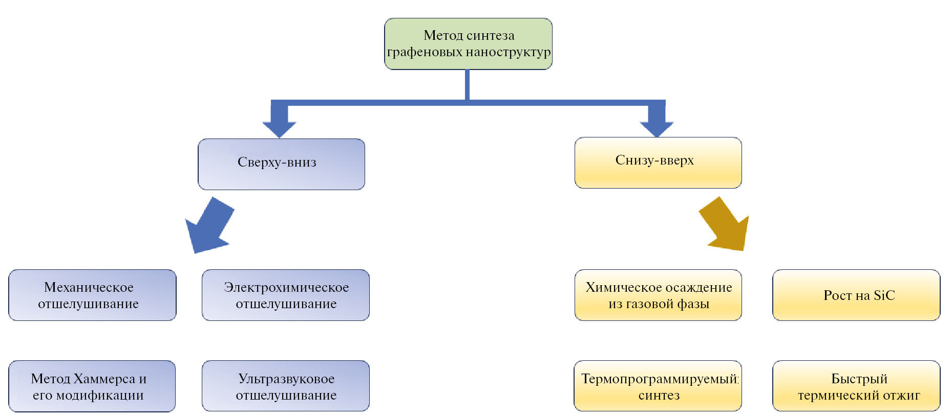 Все методики синтеза ГНС можно разделить на две основные группы: “сверху-вниз” (“top-down”) и “снизу-вверх” (“bottom-up”). В первом случае (“сверху-вниз”) синтез ГНС проводят из материла, который изначально содержит ГНС, в первую очередь из графита. Наиболее известными методами данного способа синтеза ГНС являются метод Хаммерса и его модификации [7], метод ультразвукового отщепления с использованием ПАВ [8], метод электрохимического отшелушивания [9], а также метод механического отшелушивания [10].