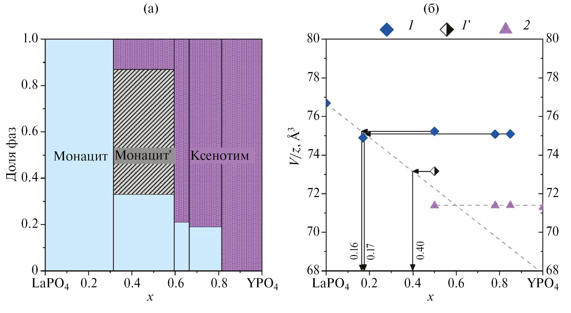 Рис. 4. Соотношение количества фаз в системе LaPO4–YPO4 после отжига при 1200°С в течение 5 сут в зависимости от содержания YPO4 (x, мол. д.) в системе (а) и зависимость объема элементарной ячейки, отнесенного к одной формульной единице структуры (V/z), от содержания YPO4 (x, мол. д.) в системе для структур: 1, 1′ – монацита, 2 – ксенотима (б).
