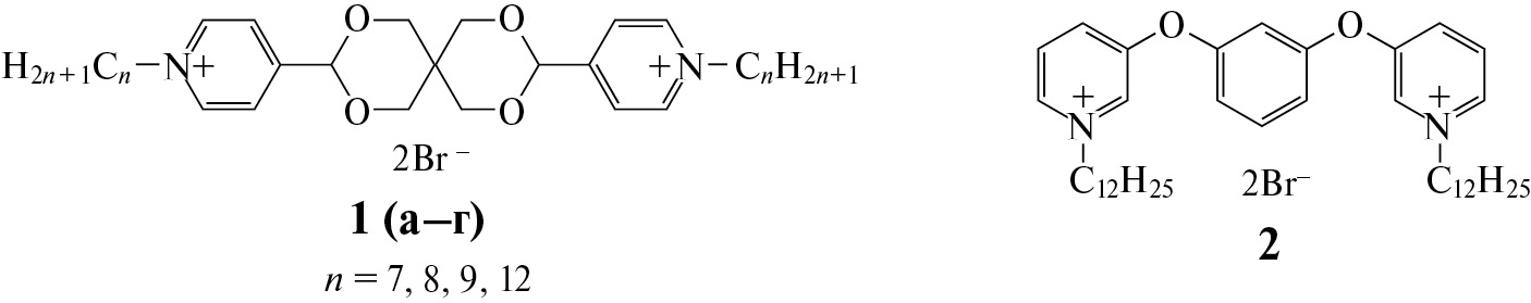 Соединения 1а–2г и 2 были синтезированы по известным методикам [26, 27]. Поверхностная тензиометрия была выбрана для определения поверхностной активности, адсорбционного и агрегационного поведения ЧАС в водном растворе.