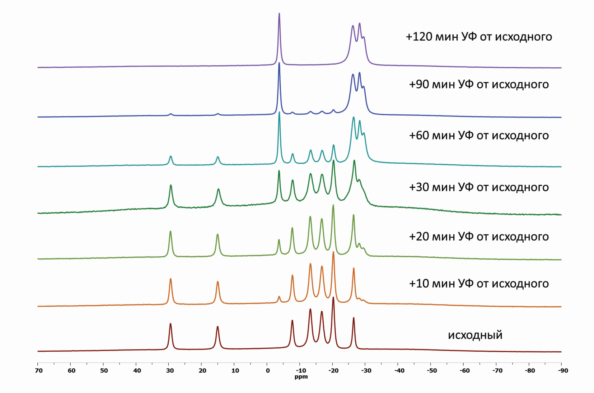 Рис. 2. 11В{1H} ЯМР-спектры реакционного раствора, демонстрирующие процесс перегруппировки аниона [B20H18]2– из транс в изо во времени в ДМФА.