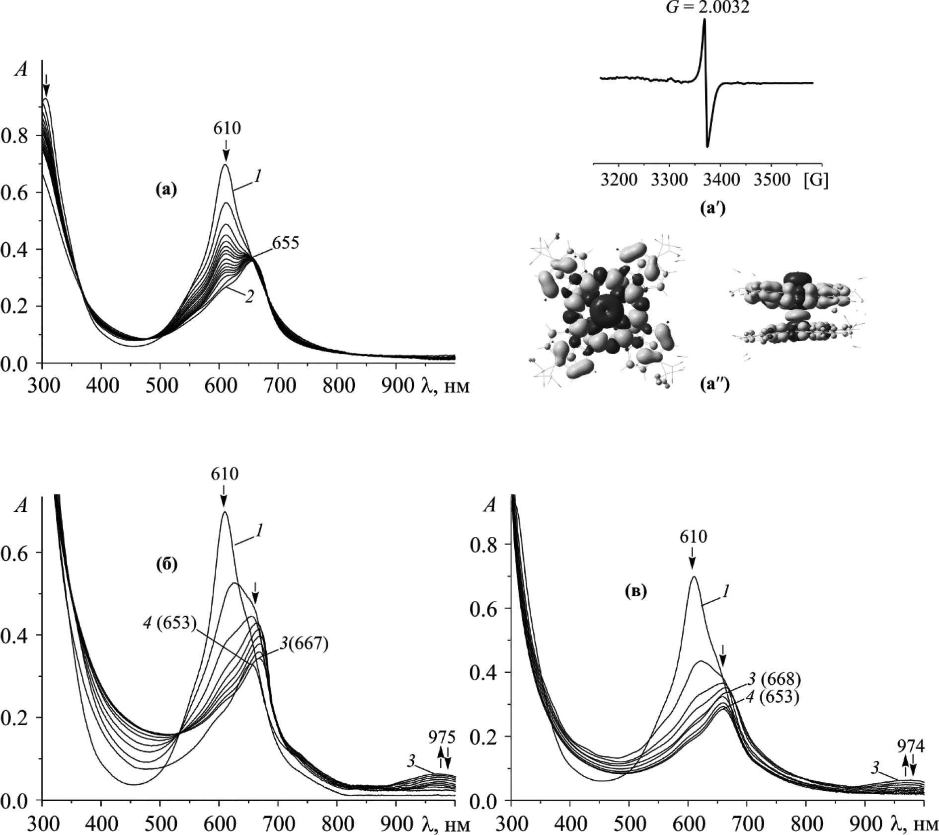 Чтобы оценить степень распределения спиновой плотности в молекуле 2, был проведен квантово-химический расчет данной частицы. В одноэлектронном окисленном комплексе 2 (дублет, S = 1/2) наблюдается относительно симметричное распределение спиновой плотности на обоих фталоцианиновых кольцах через Ru=C=Ru-мостик, что свидетельствует об эффективной делокализации спина π-катион-радикала по всей молекуле за счет сопряжения (рис. 1а′′).