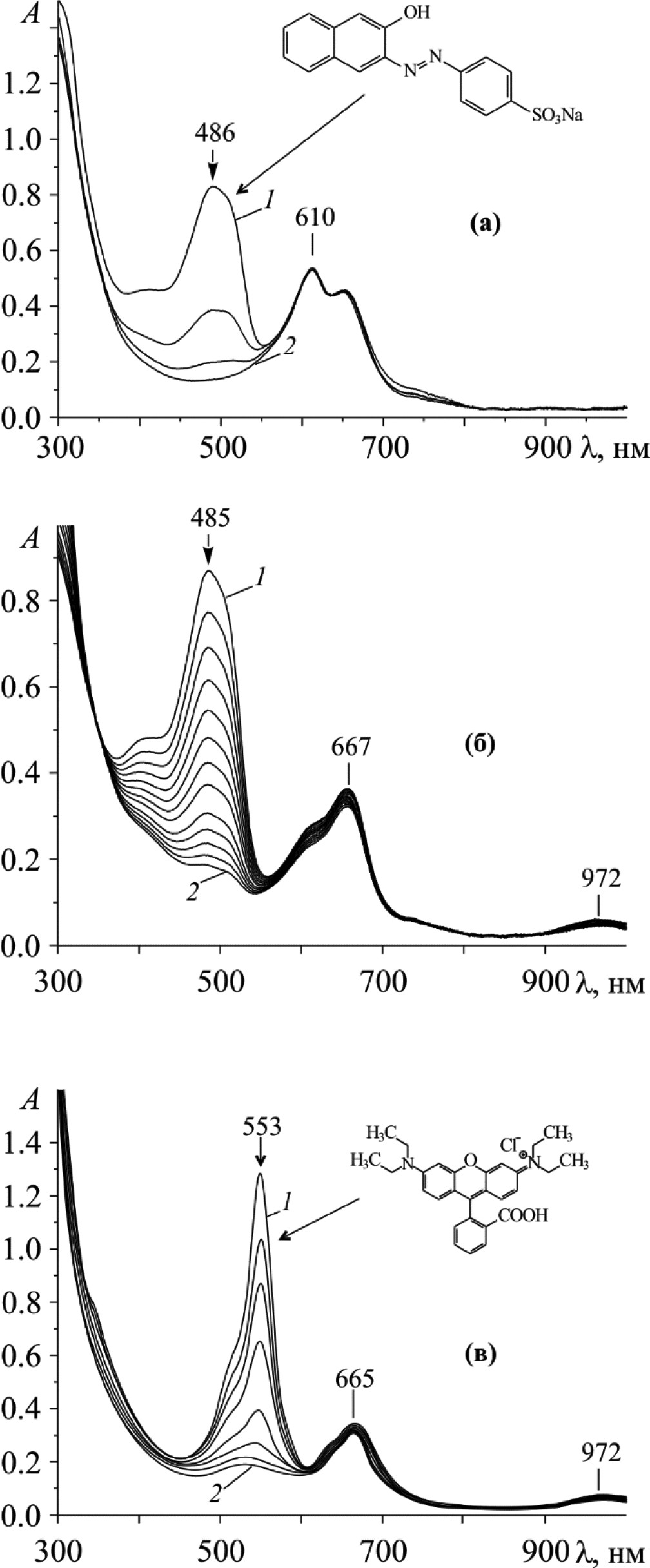 Рис. 6. Изменения ЭСП красителя при его окислительной конверсии в присутствии активных форм комплекса 1 (С1 = 5.6 × 10–6 моль/л, СtBuOOH = 3.68 × × 10–3–6.2 × 10–2 моль/л) при 298 K: а – OrangeII (COrangeII = 8.64 × 10–4моль/л)/форма 4 в буферном растворе (pH 9): 1 – сразу после добавления красителя, 2 – через 5 мин; б – OrangeII/форма 3: 1 – сразу после добавления красителя, 2 – через 18 мин; в – RB/форма 3 (CRB = 1.7 × 10–5 моль/л): 1 – сразу после добавления красителя, 2 – через 36 мин.