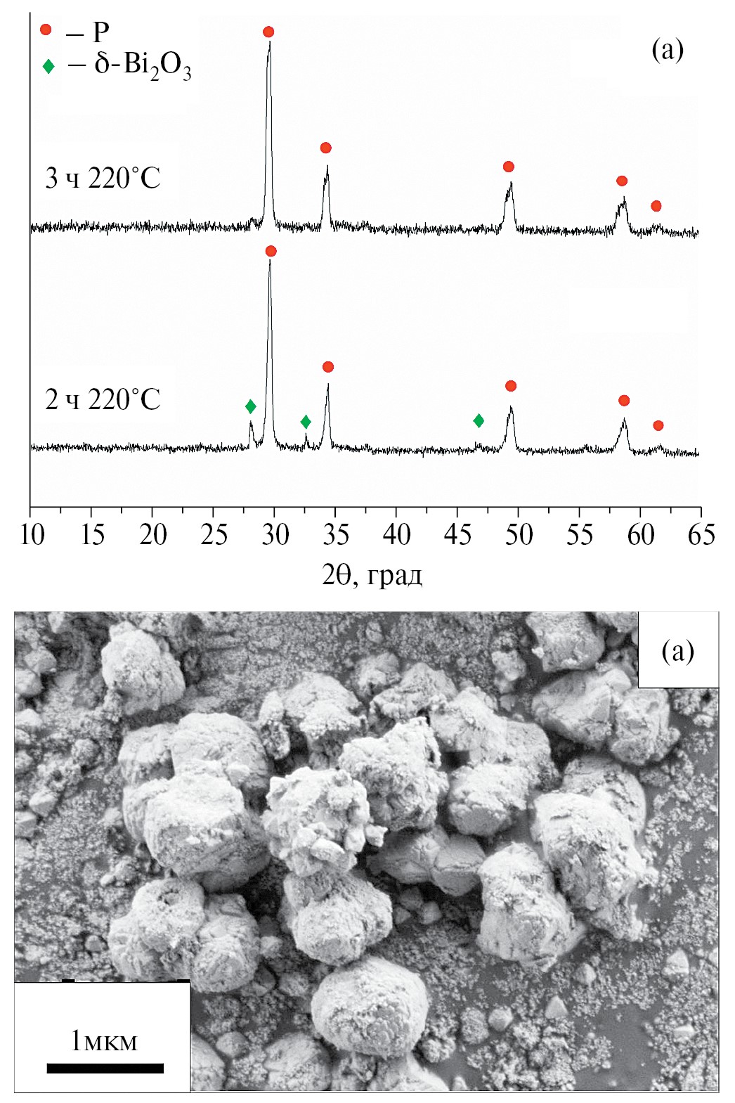 Рис. 8. Дифрактограммы образцов Bi1.5CoSb1.5O7, синтезированных в гидротермальных условиях при микроволновом воздействии в течение различного времени (а). Микрофотография образца, синтезированного в гидротермально-микроволновых условиях при 220°С в течение 3 ч (б).