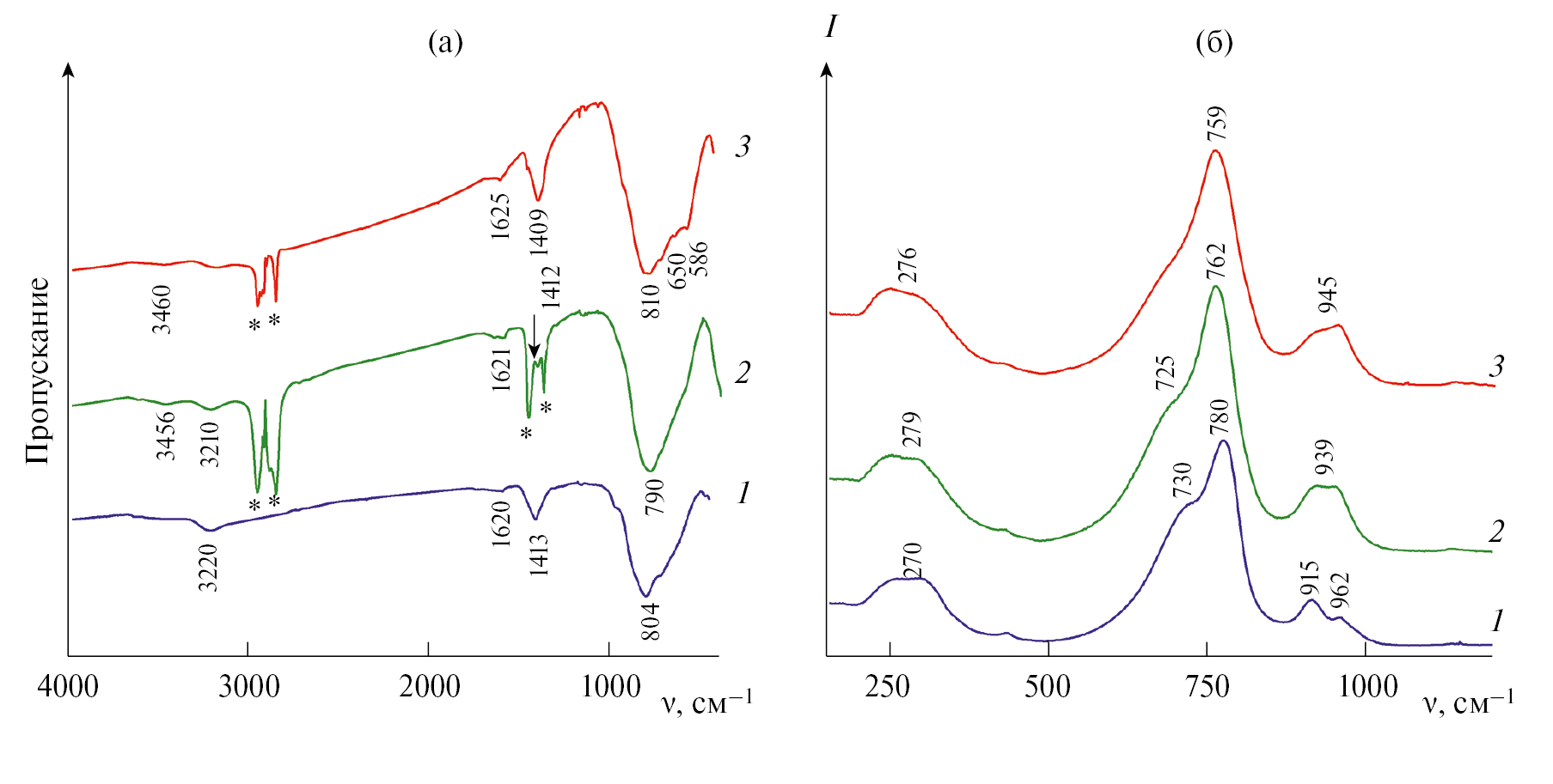 Рис. 4. ИК- (а) и КР-спектры (б) h-WO3 (1), h-W0.95Fe0.05O3 (2) и h-W0.94Fe0.06O3 (3), синтезированных при рН 1.7 и 2.3 соответственно. Полосы вазелинового масла обозначены звездочкой