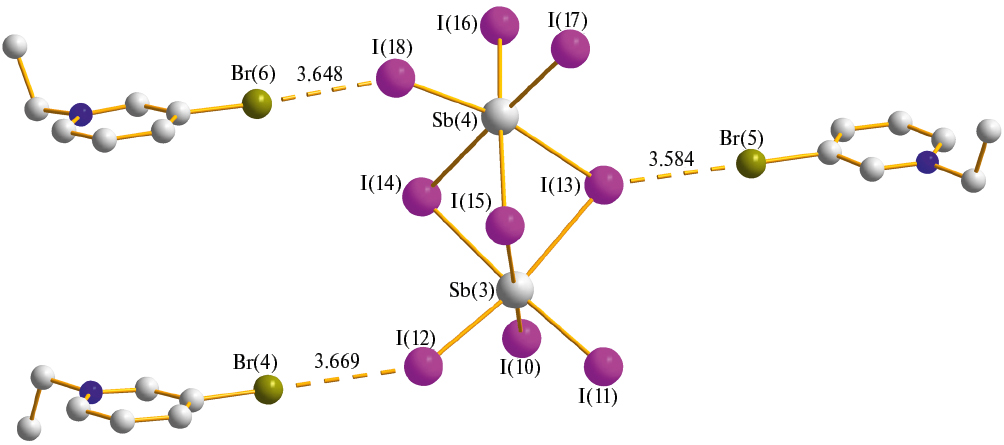 I(4)–Sb(2) | 3.1977(5) | I(12)–Sb(4) | 2.7600(6) |