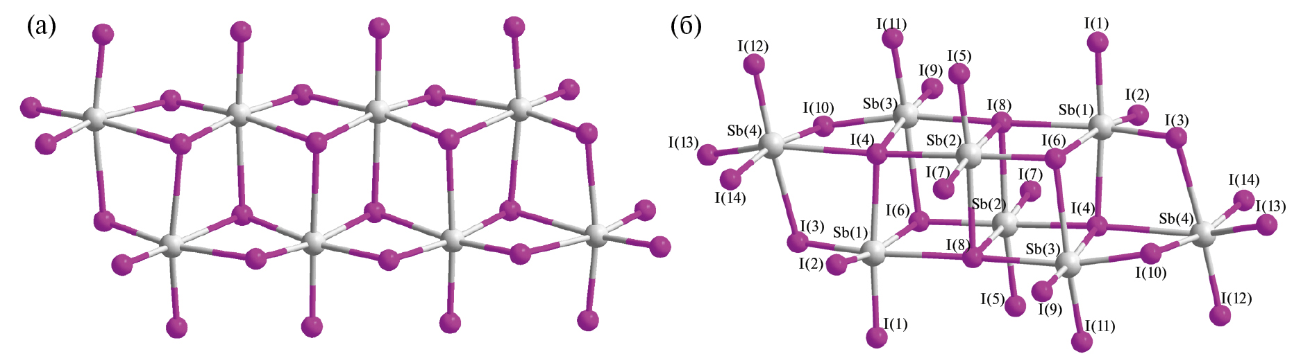 Анион соединения 2 представляет собой крупные дискретные блоки [Sb8I28]. Примеры комплексов такого состава ограничены рядом иодидных производных сурьмы [40–43] и одним бромидным [44]. Для висмута в литературе также представлен ряд октаядерных иодидных комплексов [45–48]. Атомы сурьмы в 2, в отличие от более известного структурного типа α-M8I28 [49], где атомы выстроены в две параллельные линии, располагаются в двух плоскостях и зигзагообразно чередуются (рис. 2). Известен один пример аниона такого строения в соединении [(CH3)4N]4[Sb8Cl28] [50]. Подобный способ расположения атомов сурьмы также можно обнаружить в соединении с полимерным анионом состава {Sb10I34}n [4]. В структуре 2 присутствуют четыре кристаллографически независимых атома Sb, которые отличаются своим координационным окружением. Атомы Sb(1), Sb(2) и Sb(3) связаны с двумя терминальными и четырьмя мостиковыми атомами иода (μ2, μ3 и μ4), атом Sb(4) — с тремя терминальными и тремя мостиковыми атомами I (2μ2, 1μ3) соответственно. Расстояния Sb–I приведены в табл. 2.