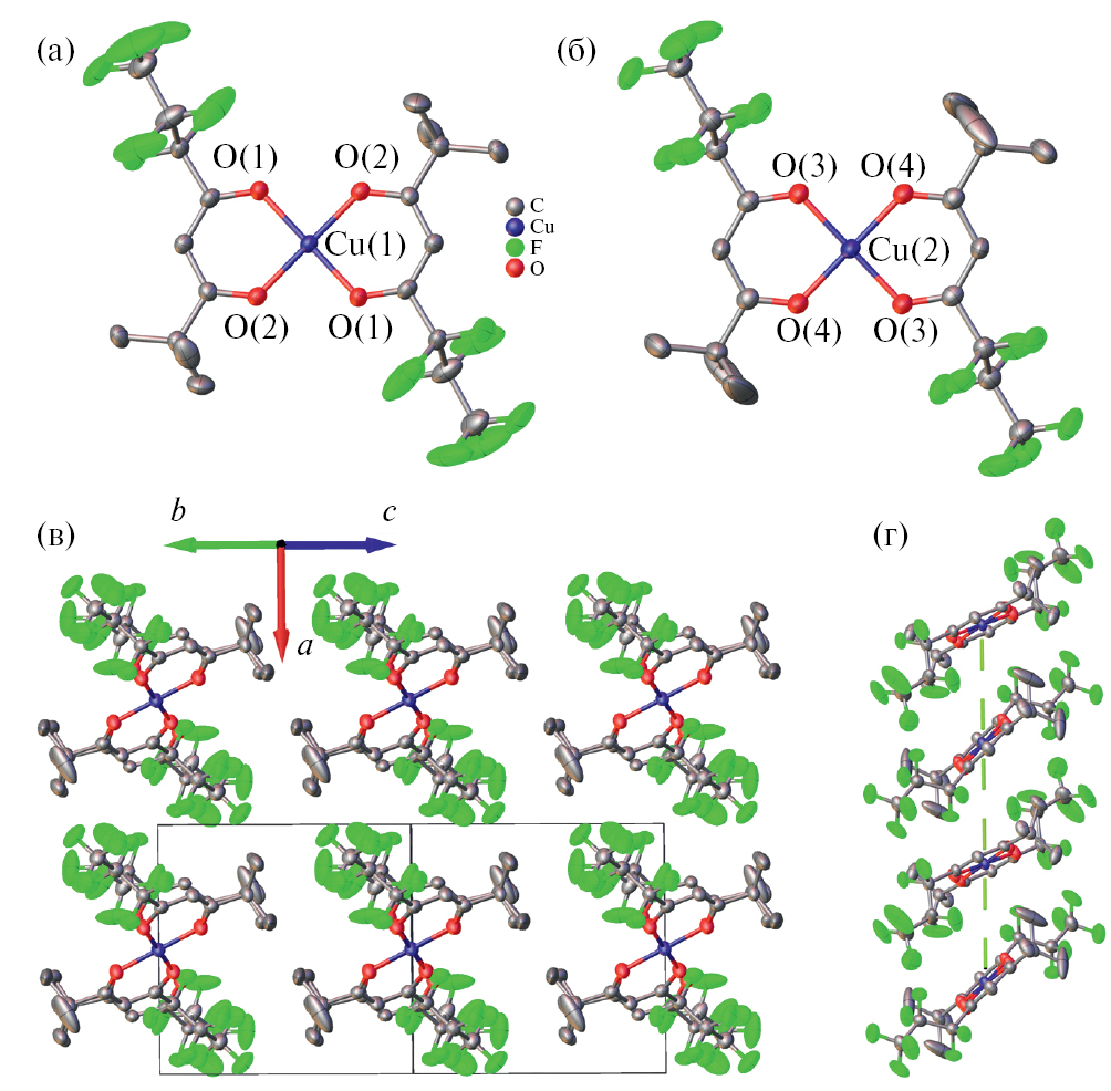 Рис. 1. Структура молекул (a, б) и диаграмма упаковки (в, г) для триклинной модификации Cu(fod)2 (II).