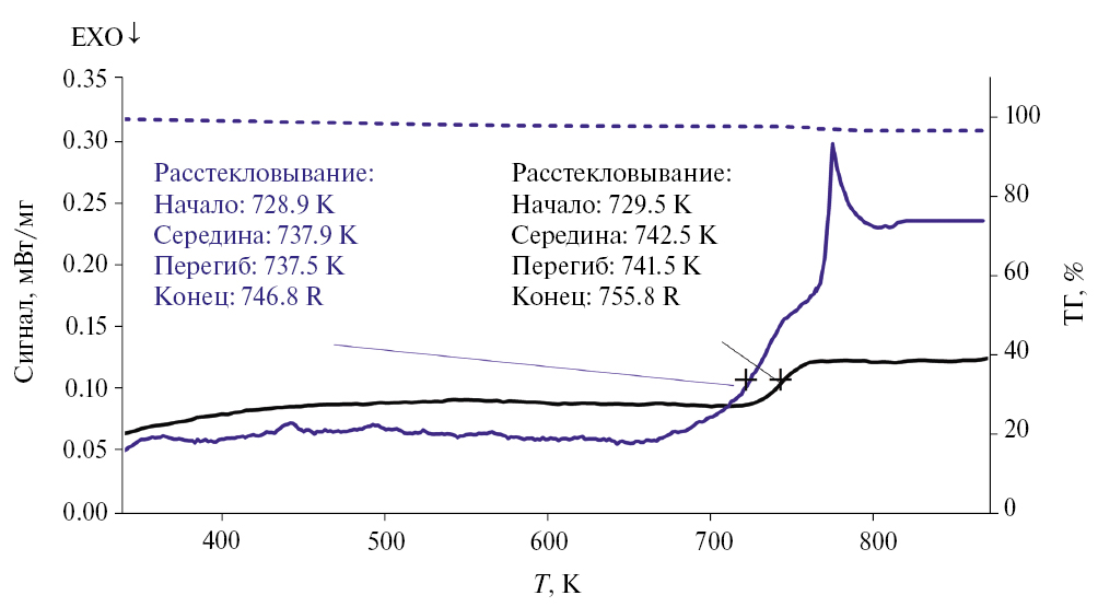 Рис. 1. СТА-кривая ультрадисперсного образца стекла 0.2Bi2O3–0.6B2O3–0.2BaO (синяя линия) и стекла такого же состава в форме диска из работы [24] (черная линия). Скорость нагревания 10 град/мин