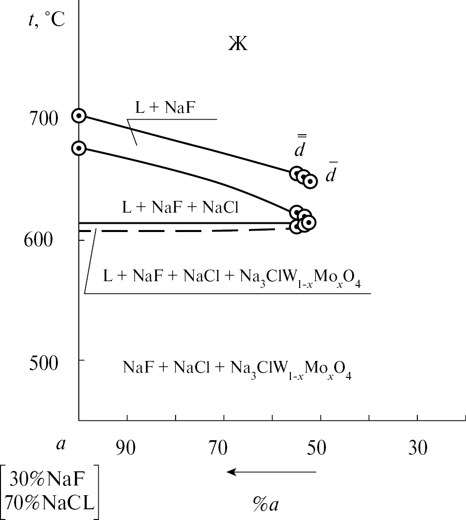 E1E3 | ж ⇄ Na3ClMoxW1–xO4 + Na4F2MoxW1–xO4 + Na2MoxW1–xO4 |