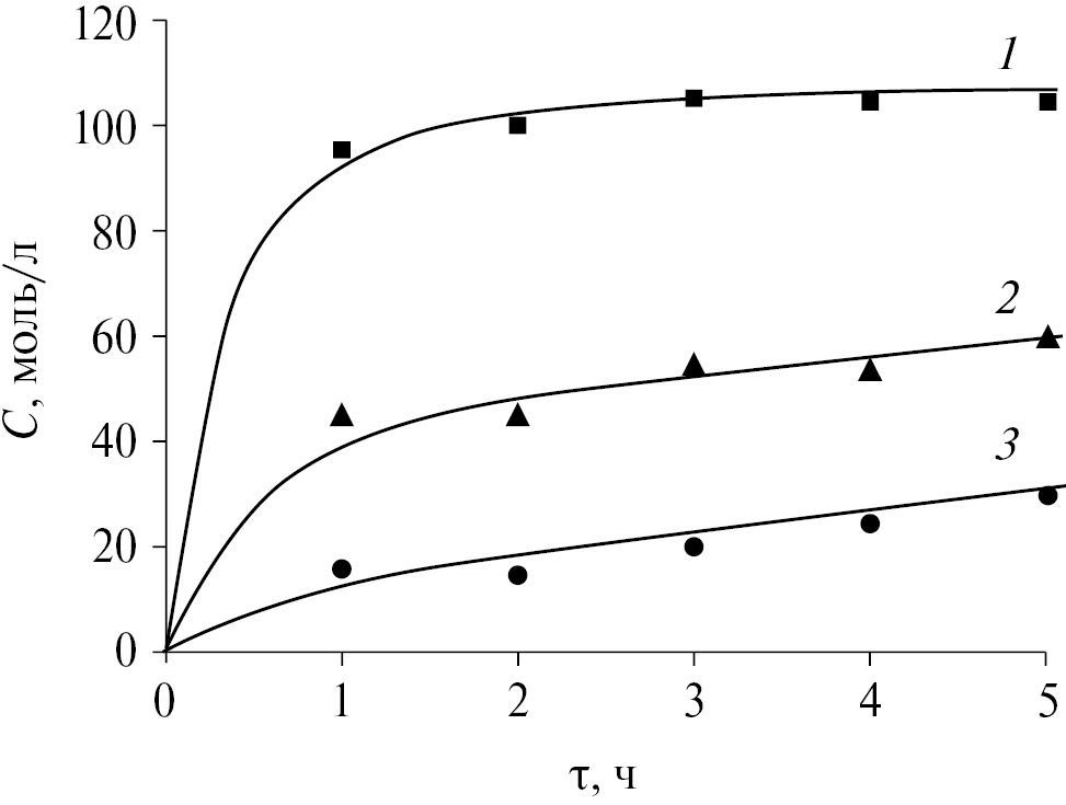 Рис. 1. Зависимости концентрации цинка в МЭ от времени выщелачивания (модельная система с ZnO) для МЭ, содержащих различные экстрагенты: 1 – Д2ЭГФК; 2 – капроновая кислота; 3 – ТБФ + уксусная кислота. Температура выщелачивания 80°С.