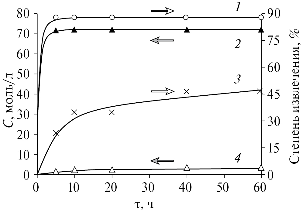 Результаты выщелачивания цинка и железа представлены на рис. 3, показаны концентрации металлов в МЭ и степени их извлечения. Выщелачивание цинка идет быстро, наблюдается выход на равновесие в течение 5 мин, степень извлечения составляет ~88% (рис. 3, кривые 1 и 2). Извлечение железа(III) протекает заметно медленнее, за 60 мин достигается степень извлечения ~47%, концентрация железа в МЭ не превышает 3.2 ммоль/л (рис. 3, кривые 3 и 4). При проведении процесса в течение 5 мин коэффициент разделения железа и цинка (соотношение концентраций цинка и железа в МЭ) составляет 45.0, при времени выщелачивания 60 мин – 22.5.