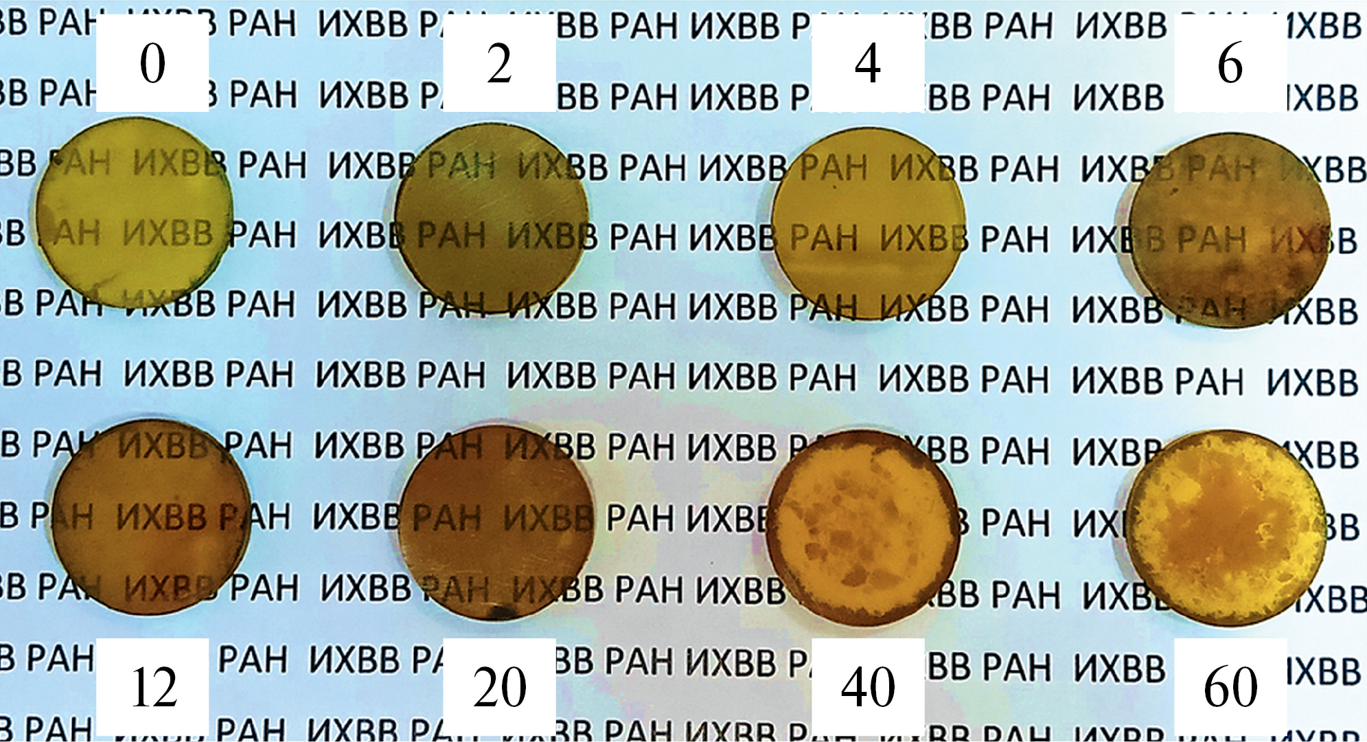 Фотографии керамик ZnSe, консолидированных в одинаковых условиях из подготовленной серии CVD-порошков, представлены на рис. 4. Образцы имеют форму диска диаметром 20 мм и толщиной 2 мм. Все керамики ZnSe, кроме образцов 40 и 60, прозрачны в видимом диапазоне длин волн. Цвет варьируется от желтого до коричнево-желтого. Визуальное заметное потемнение керамик наблюдали для образца 6 ZnSe и последующих.