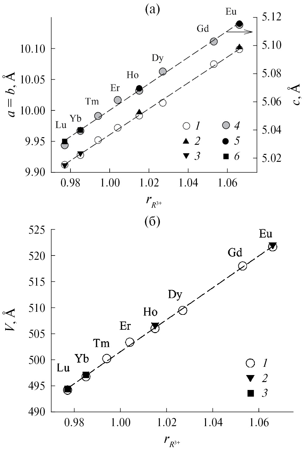 Параметры элементарных ячеек синтезированных германатов в сравнении с данными работы [16] приведены в табл. 1 и на рис. 2. Из рис. 2 видно, что с уменьшением радиуса ионов РЗМ () значения параметров (a, c и V) элементарной ячейки германатов CaR2Ge4O12 закономерно снижаются. Эти данные хорошо описываются линейными уравнениями: