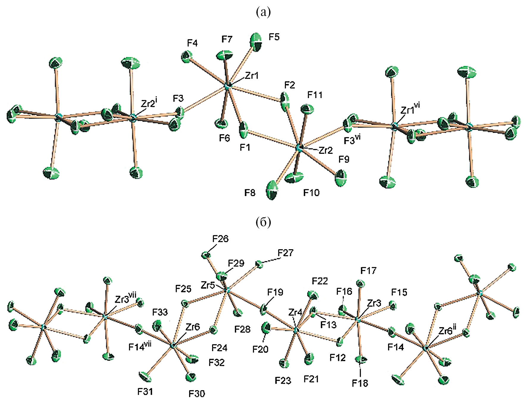 Полиморфный переход происходит без существенной перестройки структуры II: ZrF7-семивершинники объединены по общим ребрам в димеры, димеры общими вершинами связаны в бесконечные зигзагообразные цепи вдоль направления [001]. Отличием структуры III от структуры II является полная упорядоченность атомов фтора, что приводит к утроению периода b и объема элементарной ячейки и увеличению втрое числа неэквивалентных атомов структуры. В результате фазового перехода в III формируются два типа структурно-неэквивалентных циркониевых цепей: первый тип образуют ZrF7-полиэдры атомов Zr1 и Zr2 (рис. 5a), второй – ZrF7-полиэдры атомов Zr3–Zr6 (рис. 5б). Циркониевые цепи каждого типа уложены в стопки, параллельные плоскости (010), таким образом, что вдоль периода b две стопки второго типа чередуются со стопками первого типа (рис. S6). Координационными полиэдрами атомов циркония остаются искаженные пентагональные бипирамиды.