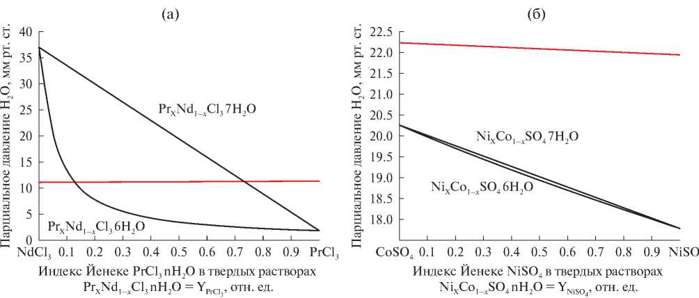 Рис. 1. Диаграммы десольватации идеальных твердых растворов на примере тройных систем PrxNd1 − xCl3 · 6H2O − PrxNd1 − xCl3 · 7H2O − H2O (слева) и NixCo1 − xSO4 · 6H2O − NixCo1 − xSO4 · 7H2O − H2O (справа) при 25°С. Красным цветом представлена зависимость парциального давления растворителя над насыщенными жидкими растворами (на диаграммах растворимости соответствующих систем).