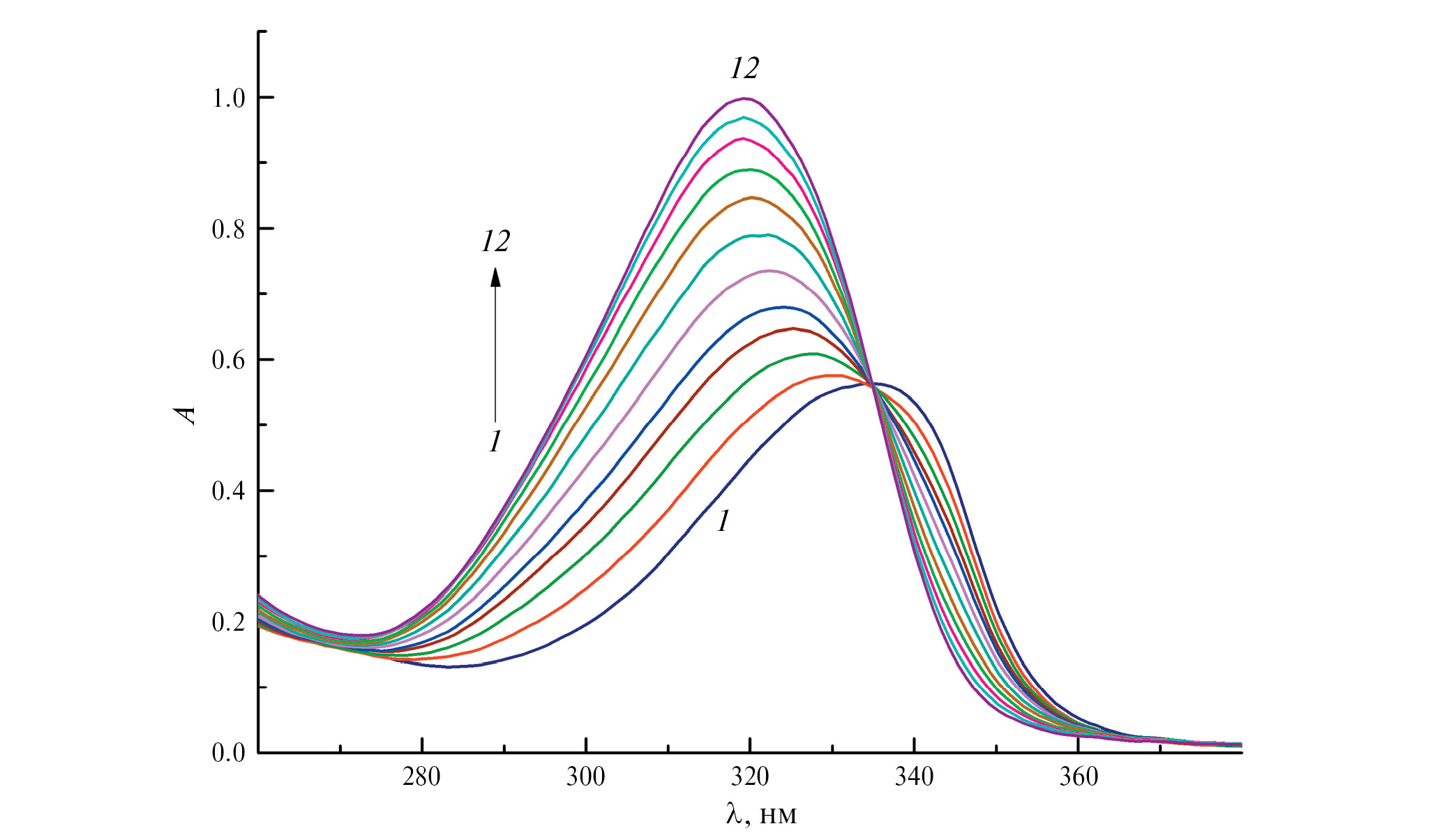 Рис. 6. Изменение во времени УФ-спектра раствора при взаимодействии Au(C9H19N4)2+ с GSH. CAu = 5.2 × 10–5 моль/л, CGSH = 1.0 × 10–3 моль/л; τ = 8 c (1), 5 (2), 15 (3), 25 (4), 35 (5), 45 (6), 55 (7), 70 (8), 90 (9), 115 (10), 140 (11), 230 мин (12); pH 7.4, l = 1 см.