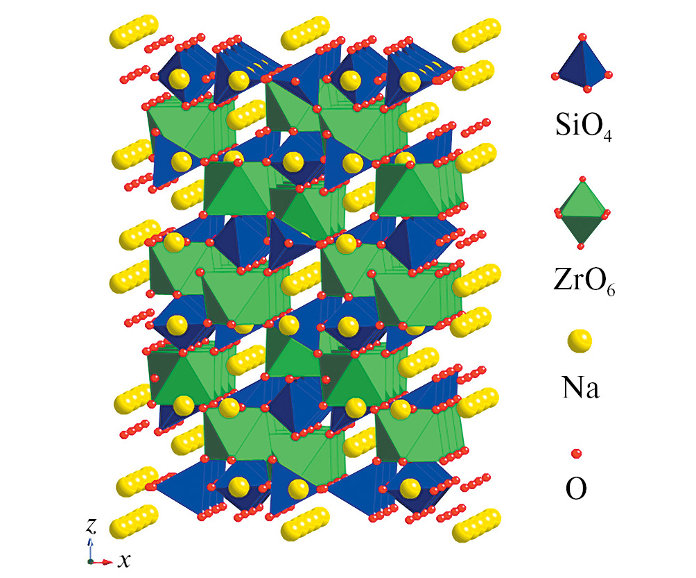 Среди каркасных цирконосиликатов заслуживает внимания соединение состава Na4Zr2(SiO4)3 (гексагон., пр. гр. R3c), которое является крайним членом ряда твердых растворов Na1+xZr2(SiO4)x(PO4)3–x (х = 3) структурного типа NASICON (гексагон., пр. гр. Rc) [5, 6] (рис. 1) и характеризуется катионообменной активностью за счет высокой подвижности катионов Na+, локализованных в каналах каркасной структуры [7, 8]. Гексагональная фаза Na4Zr2(SiO4)3 обычно ассоциирована с фазой Na4ZrSi3O10 (монокл., пр. гр. C2/c), которая является нестабильной и за счет этого претерпевает превращение в гексагональную модификацию.
