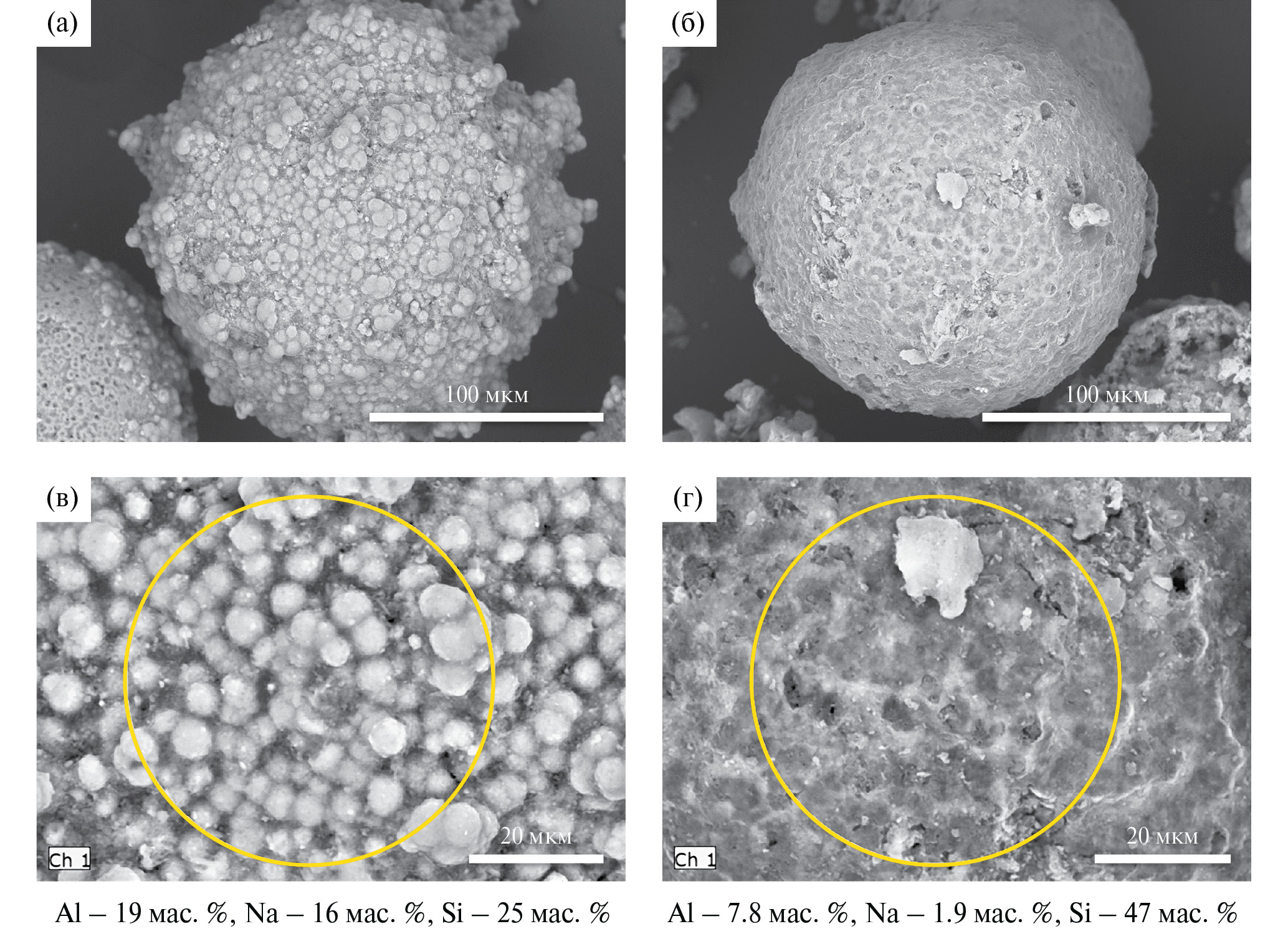 Рис. 3. РЭМ-снимки продуктов цеолитизации (а) и цеолитизации-деалюминирования (б) исходных ценосфер; участки поверхности модифицированных ценосфер по данным ЭДС (в, г).