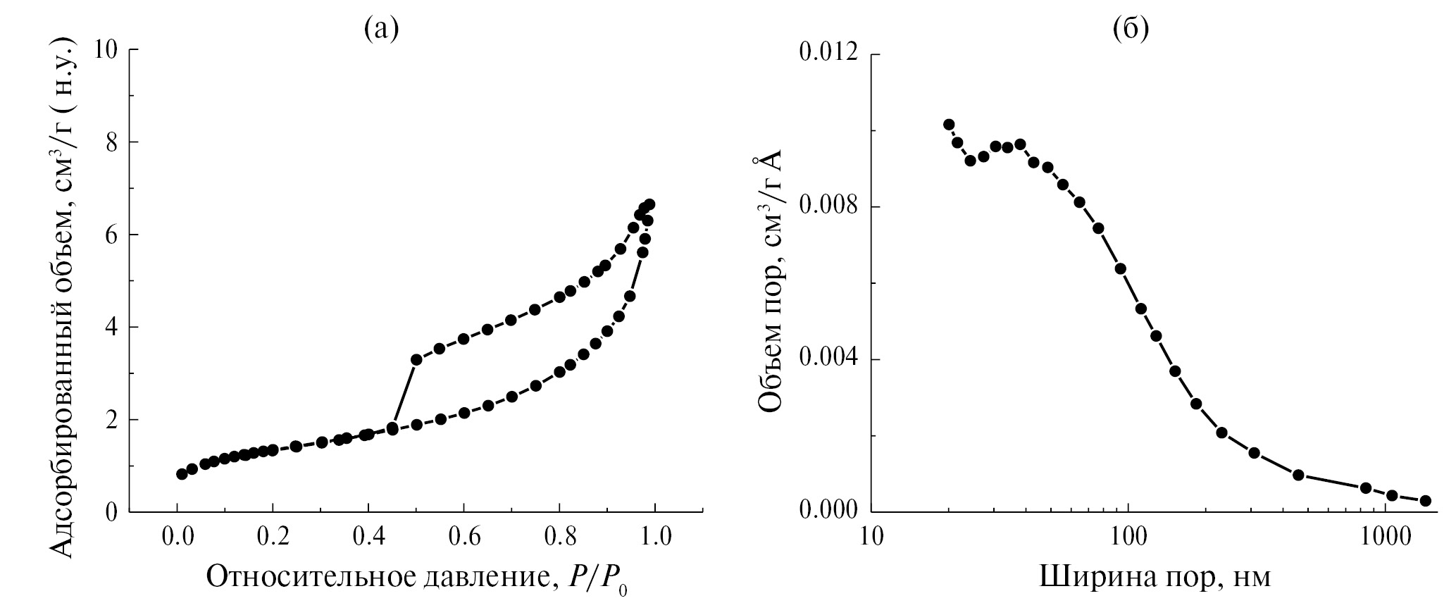 Текстурные характеристики полученных образцов определяли на сорбционном анализаторе пористости и удельной поверхности ASAP-2020 (Micromeritics, США) методом низкотемпературной адсорбции азота (чистота 99.999%; марка 5.0) при 77 K в интервале Р/Р0 = 0.01–0.99. Расчет площади удельной поверхности осуществляли по методу Брунауэра–Эммета–Теллера [24] с корректировкой интервала Р/Р0 в соответствии с методом, учитывающим наличие микропор, регламентируемым международным стандартом [25]. Анализ микропористости, а именно определение объема и удельной поверхности микропор, выполняли с помощью сравнительного t-метода с использованием уравнения Харкинса–Юра [26, 27] для расчета толщины статического слоя адсорбата.