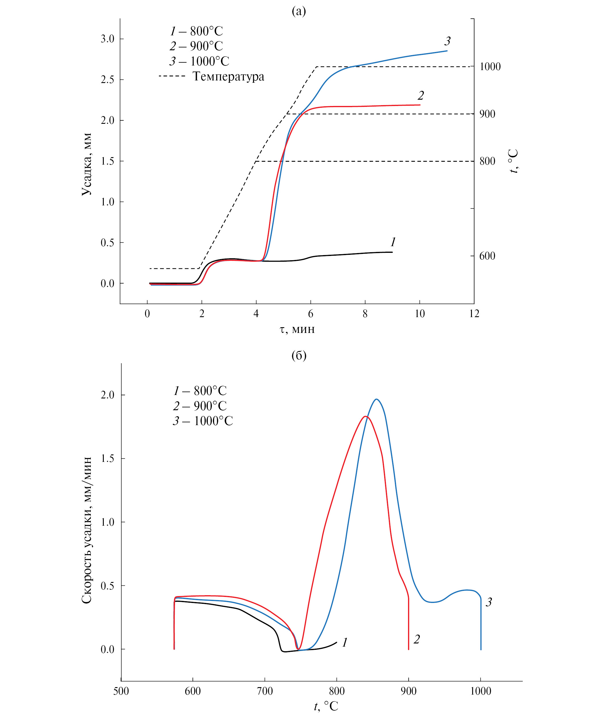 Для представленных керамик характерны два этапа интенсивного уплотнения. Первый этап в диапазоне температур 600–750°С представляет начальную пластическую диффузию, возникающую в результате начального разогрева и приложенного постоянного давления. Второй этап в диапазоне 750–900°С представляет зернограничную диффузию. Дальнейшее повышение температуры приводит к деструкции пор в объеме керамики, что сопровождается дальнейшей усадкой материала. Как видно из рис. 8, достижение максимальной температуры 1000°С не выводит дилатометрическую кривую на плато. Такое поведение говорит о незавершенности процесса объемной диффузии.