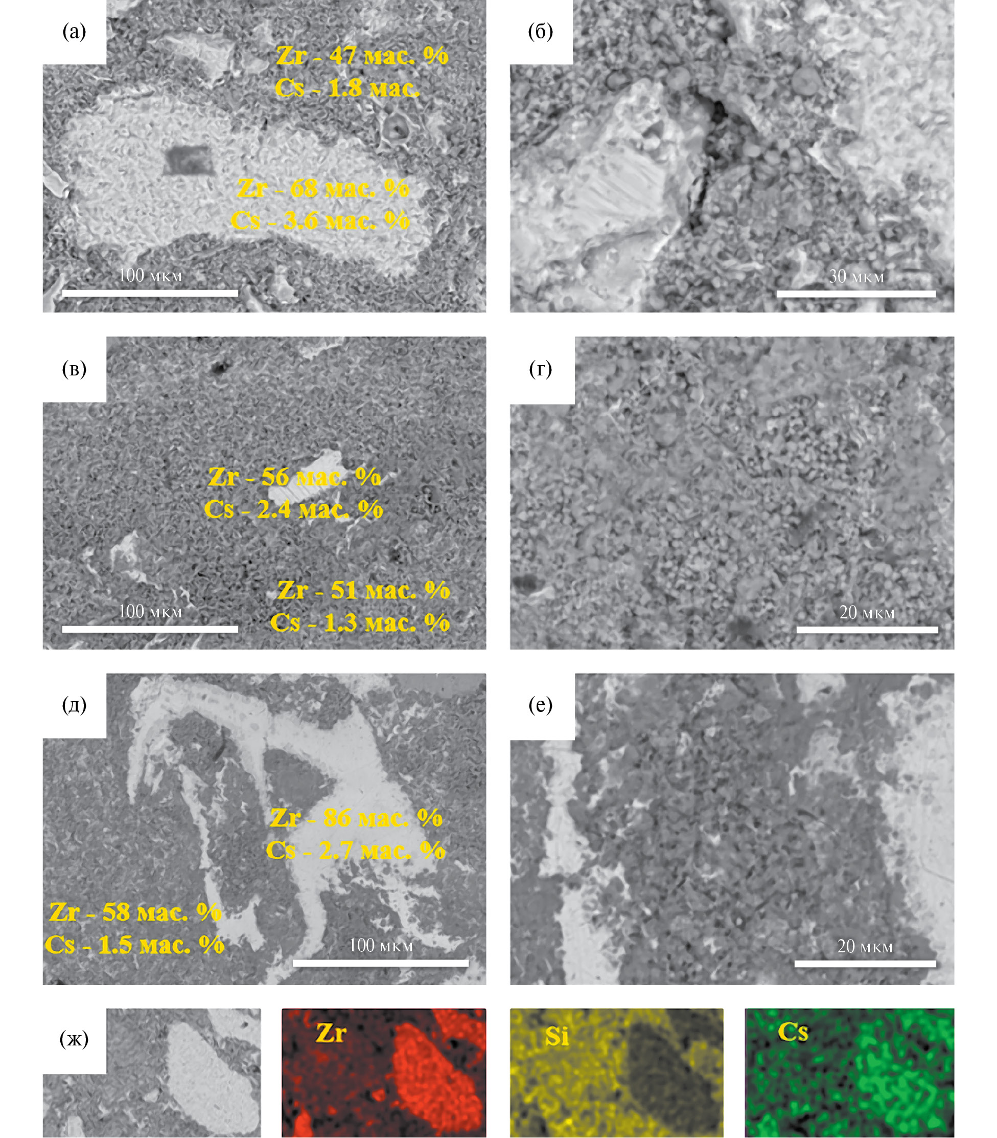 Влияние температуры на морфологию поверхности и структуру объемных керамик, полученных в токе искровой плазмы, наглядно представлено на РЭМ-снимках (рис. 9), из которых видно, что в области невысоких температур (800–900°С) происходит спекание порошка цирконосиликата по границам контактов частиц, при этом сохраняется их форма и размер (рис. 8а–8г). Высокотемпературная обработка порошка (1000°С) приводит к разрушению пористой структуры из-за их деструкции и сплавления. Образуется плотный компаунд монолитной структуры (рис. 8д–8е). Вместе с тем на снимках наблюдается неоднородная микроструктура керамик за счет выделения областей, обогащенных цирконием, что указывает на полифазный состав продуктов спекания. Цезий распределен по всей поверхности керамики, при этом его содержание на участках, обогащенных цирконием, почти в два раза превышает концентрацию цезия в областях с меньшим содержанием циркония (рис. 9а, 9б, 9д, 9ж). Это может указывать на то, что за сорбцию цезия отвечают прежде всего цирконийсодержащие фазы.