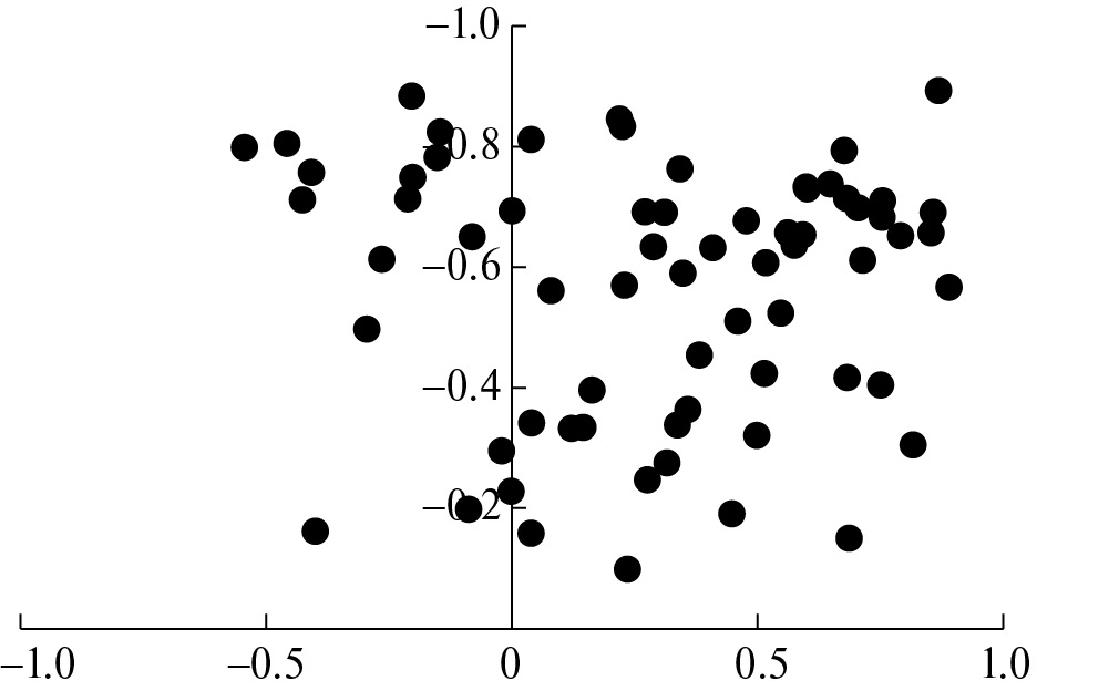 Рис. 4. Соотношение между характером связи WG(D) и S(D) на участках естественных (полуестественных) и синантропных растительных сообществ. По оси абсцисс — RWD, по оси ординат — RSD. RWD — теснота связи между степенью доминирования определенного вида (D) и биомассой сообщества (WG), оцененная путем расчета коэффициента корреляции рангов Спирмена; RSD — коэффициент корреляции Спирмена для соотношения между степенью доминирования определенного вида (D) и числом сопутствующих видов (S).