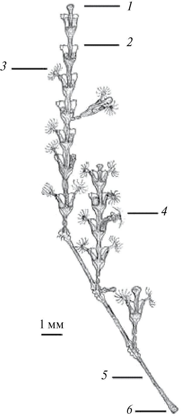 Рис. 1. Рисунок короткой колонии Dynamena pumila (L., 1758), выращенной из побега, взятого от большой колонии. Обозначения: 1 — верхушка роста побега; 2 — модуль побега, включающий два гидранта в гидротеках; 3 — гидрант с расправленным венчиком щупалец; 4 — гидрант, поглощающий науплия рачка; 5 — столон; 6 — верхушка роста столона.