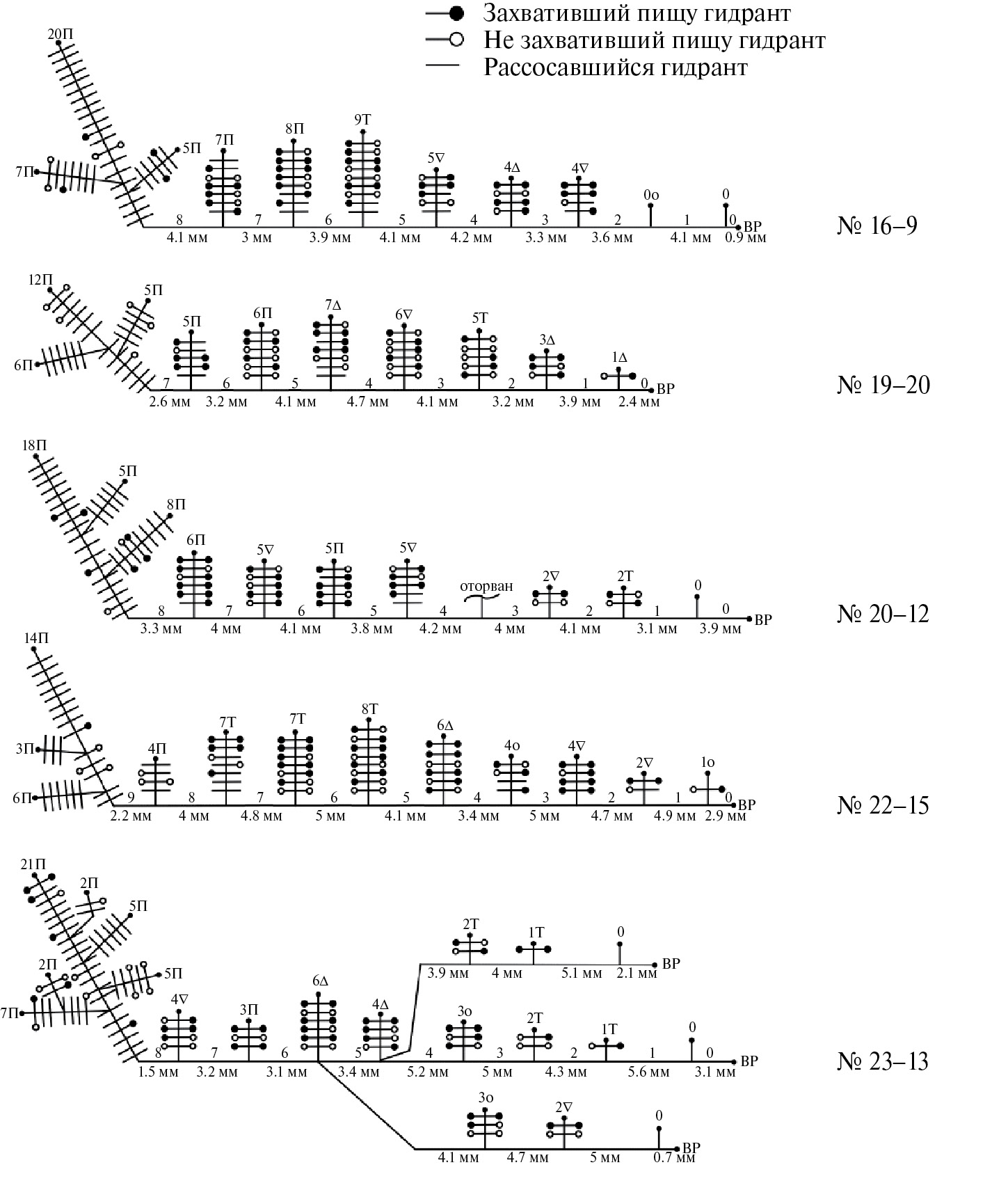 Рис. 2. Схемы вторичных (выращенных из отдельных побегов) колоний Dynamena pumila в начале эксперименте (06.07.2022). Справа от схем номера колоний. Обозначения: под столонами указана длина модулей (междоузлий между побегами) в миллиметрах. Над столонами номера модулей от верхушки роста (ВР) к первому (материнскому) побегу. Число пар гидрантов на стволах и ветвях побегов обозначены поперечными черточками. Черные кружки — активные гидранты, белые кружки — рассасывающиеся гидранты, отсутствие кружков — пустые гидротеки без гидрантов. Над побегами указано число модулей (пар гидротек) и стадия верхушки побега при формировании модуля побега в последовательности: о → ˄ → ˅ → Т → П.